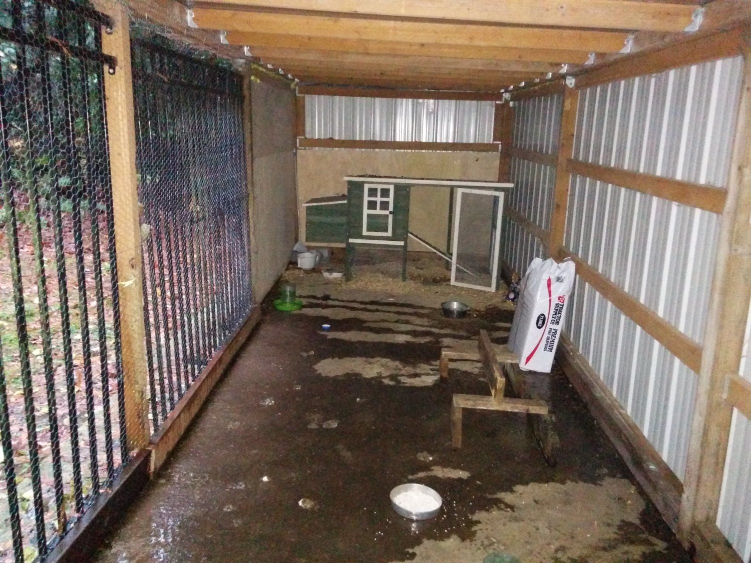 Yes, it has a roof. The water just slowly seeps under the boards we have at the bottom of the bars. Not enough to flood things, but enough to keep it continually damp. The part on the far left is where the small coop is located, enclosed on three sides by sheet-metal, two of which are partially insulated with plywood as well.
