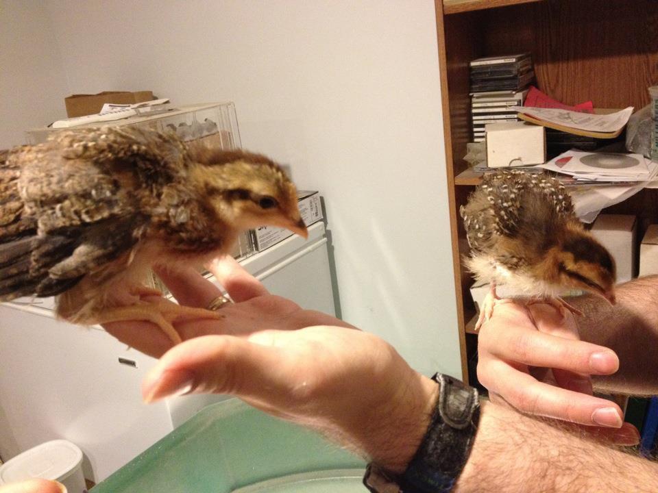 Dang it's hard to take a good pic of two wiggly chicks! Anyway, here are my 2 spotted Sussex chicks, Tikka and Masala: