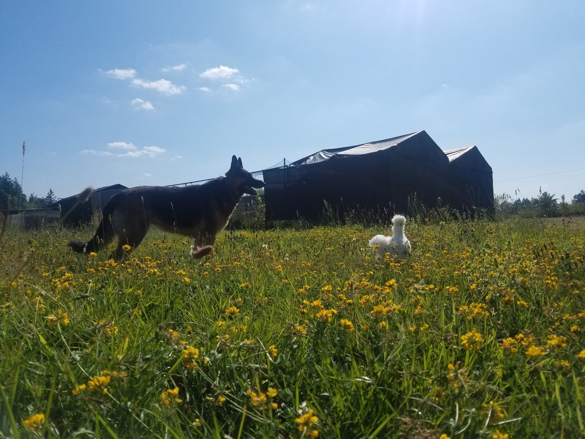 This morning we took a 3x5 wire dog cage and put 5" of hardware cloth all around the bottom of the walls. Now everyone is happily playing and safe in the sunshine.
