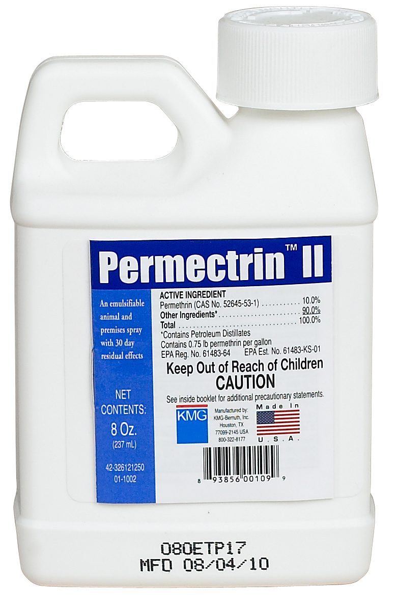 Permectrin II: Insecticide spray with 30 day residual effect. Active ingredient: 10% Permithrin