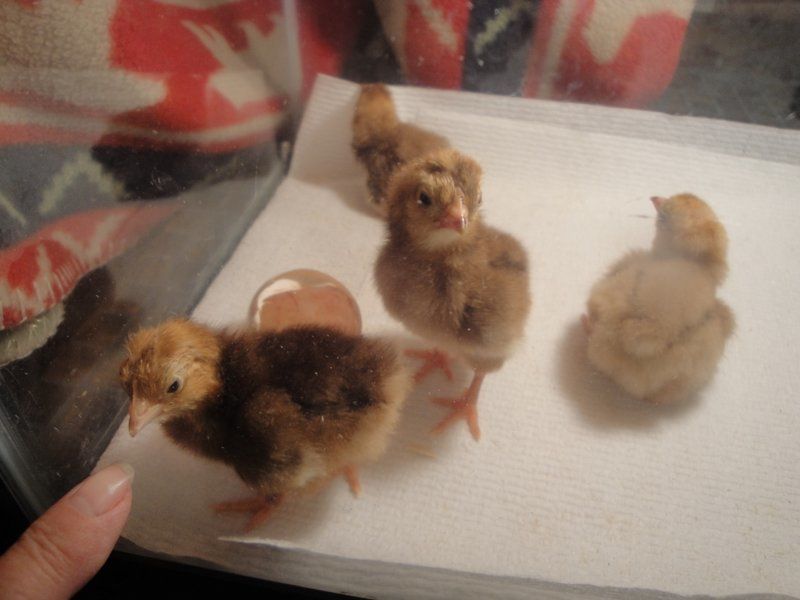The 'Bazinga!' kids in the intensive care brooder. An old ten gallon aquarium. I sing to pipping and zipping chicks so they imprint and come to my voice after hatching.