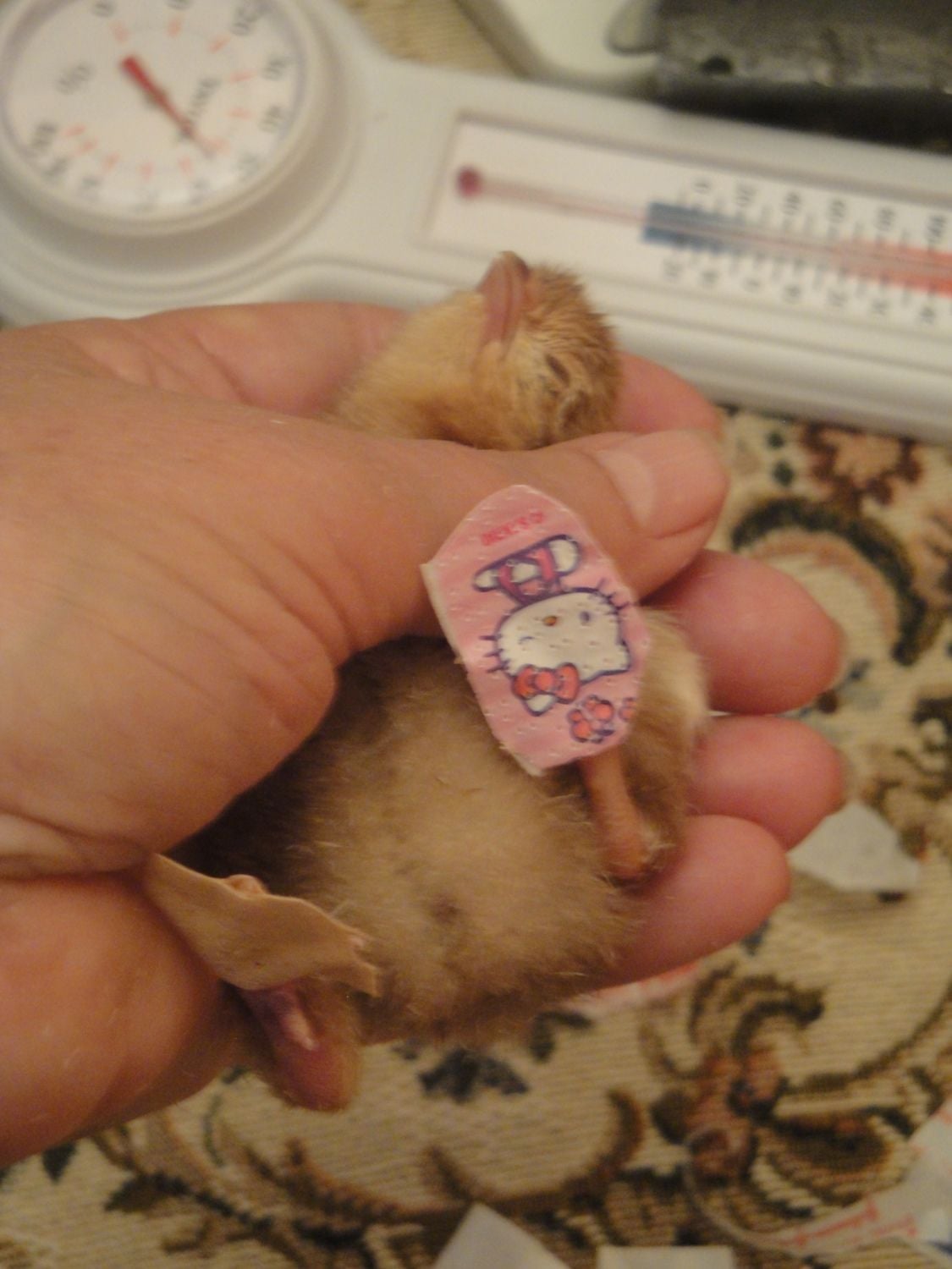 Bazinga!!!!!!!!!! Hello chicky kitty.Two chicks hatched today. The 22nd day! Usually I lose these late chicks because of various problems. Not this time! They look good. I've named them the "Bazinga!" kids! Last to hatch had deformed toes. No worries. I cut sticky bandages to fit her little feet. Yes...One of them is a Hello Kitty bandage.