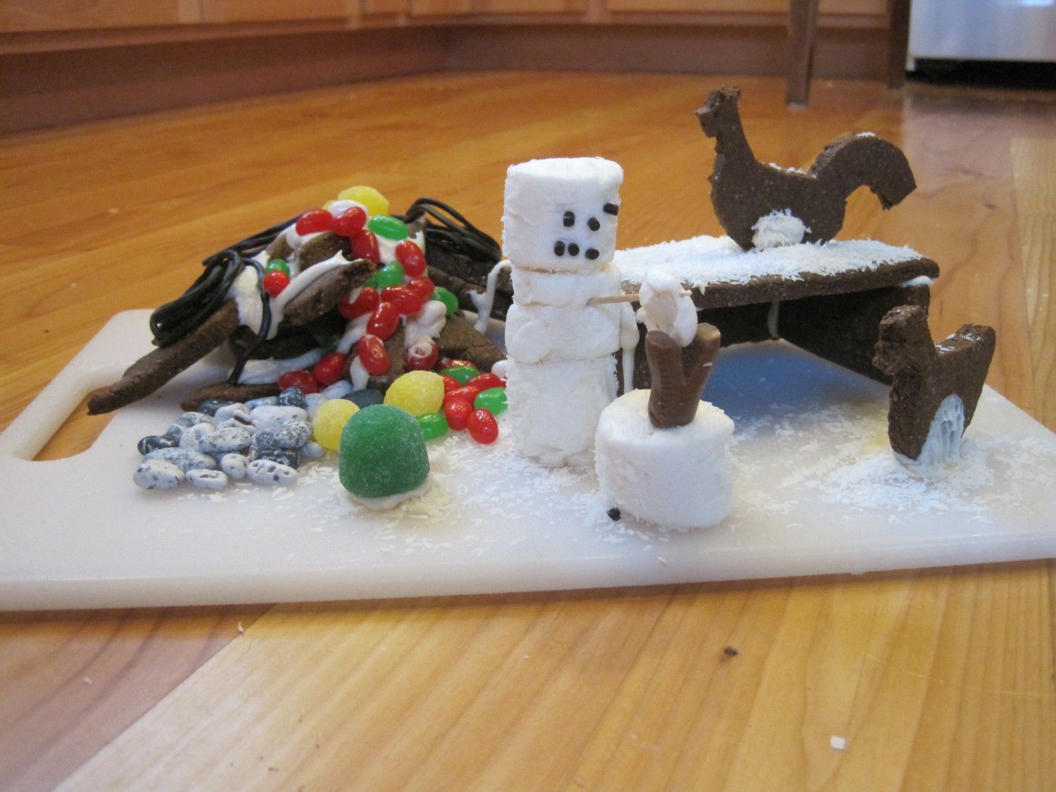 Of course, this is the side that the neighbors don't get to see. The chickens know that Marshmallow Farmer's axe is for the tootsie roll log, not them. Behind the coop is the Pile that homebuilders know all too well: the detritus of leftover building materials, and this gingerbread house is no exception!