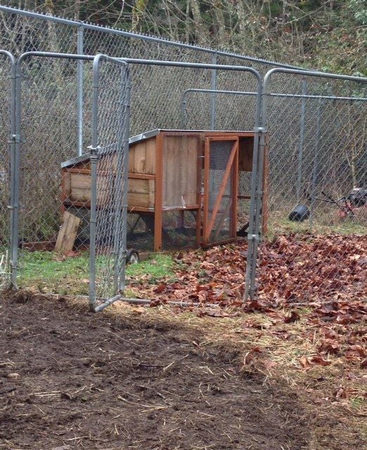 Here's our first coop, which we will be using to raise the younger birds, since it's built with 1/2" wire to keep them safe, and we can keep them in the kenneled-off area to keep our older hens from picking on them :