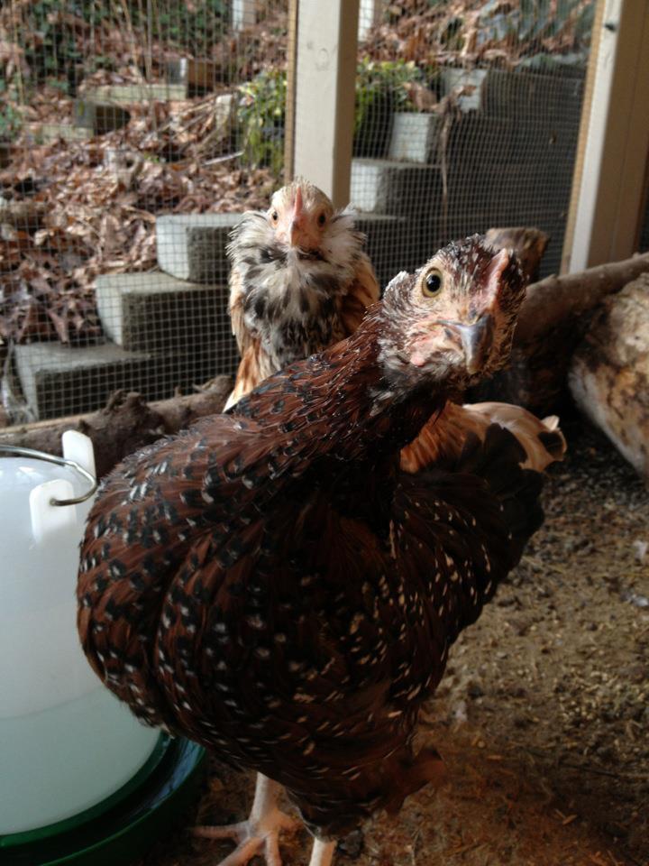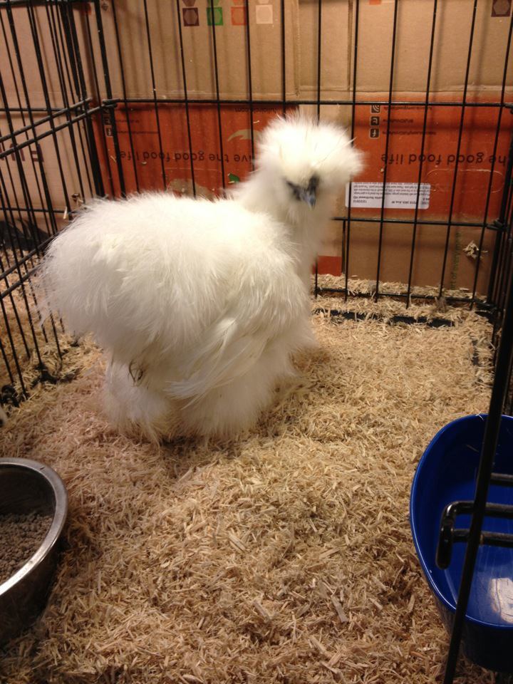 The two white silkie boys spar constantly when they are loose in the garage. I can tell them apart right now because one of them has lots of pin feathers (I call him Pinhead, he starts the fights, too), but I don't know if I'll be able to do it for long. If anyone is interested, one of these boys is still available!