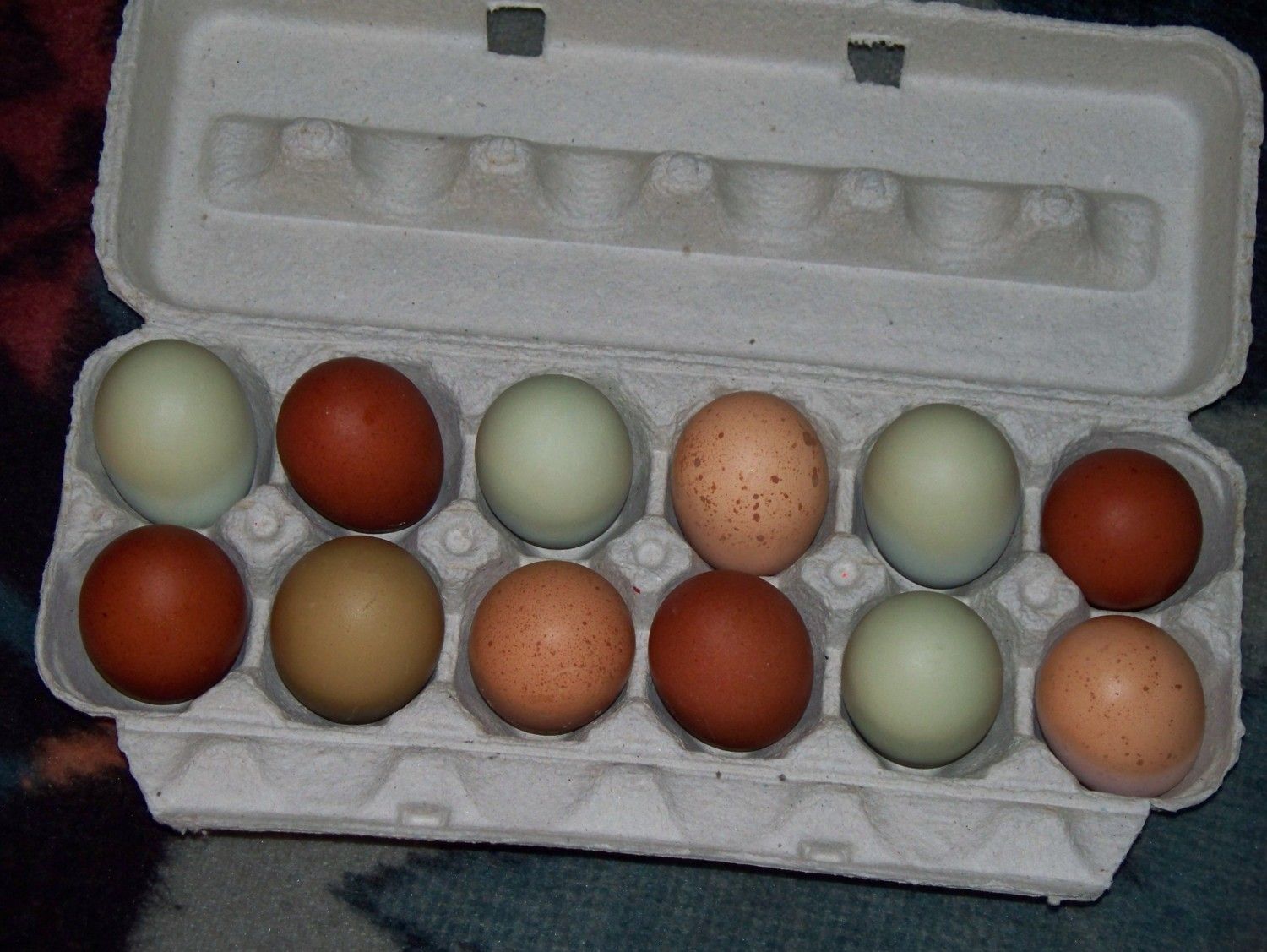 Two flavours OE shown here, one Marans (a dark brown egg layer)xAmeracauna (the dark olive egg) and the many light green eggs are Rock (a light brown layer) x Ameracauna, producing a lighter green egg.