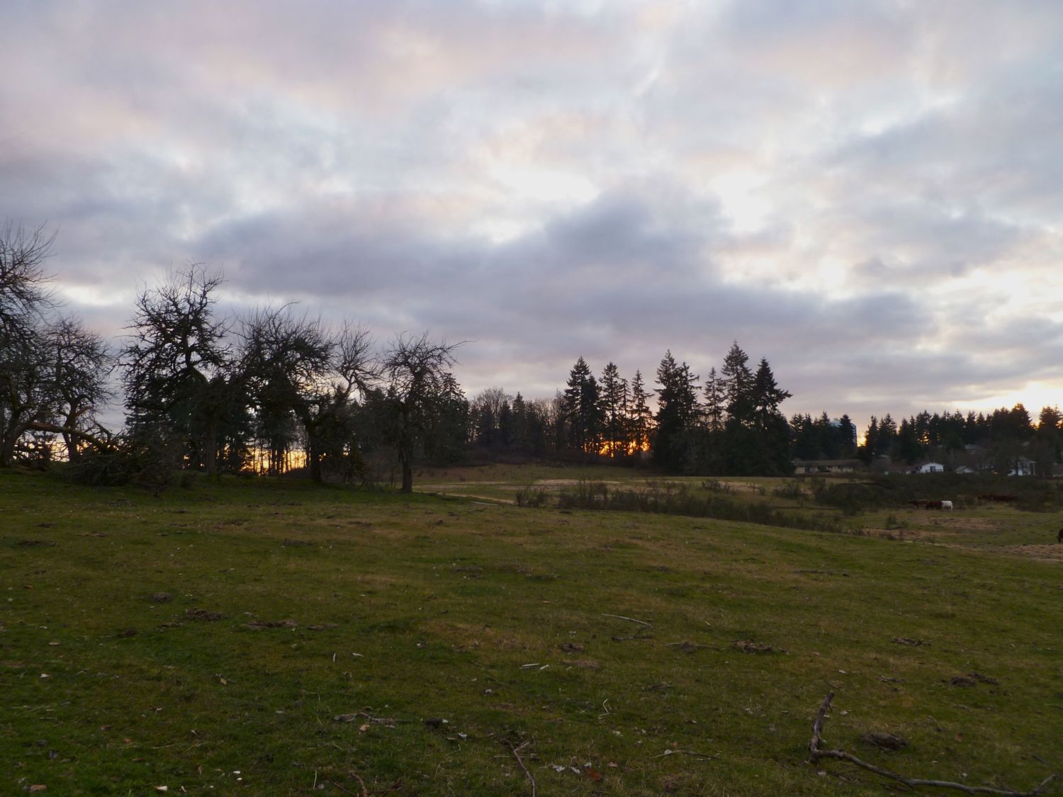 I went out and stumbled around in the cold rain for an hour and a half this morning, and got soaked through a weatherproof Carhardt hoodie over a boiled wool jacket looking for a calft that wasn't born with- of course the cow thought she had a calf, too, no wonder I was confused. Apparently she and her half-sister were laboring close together in the copse of trees at the north end of the hill (The tallest trees just right of center in this photo, sunset two nights ago)