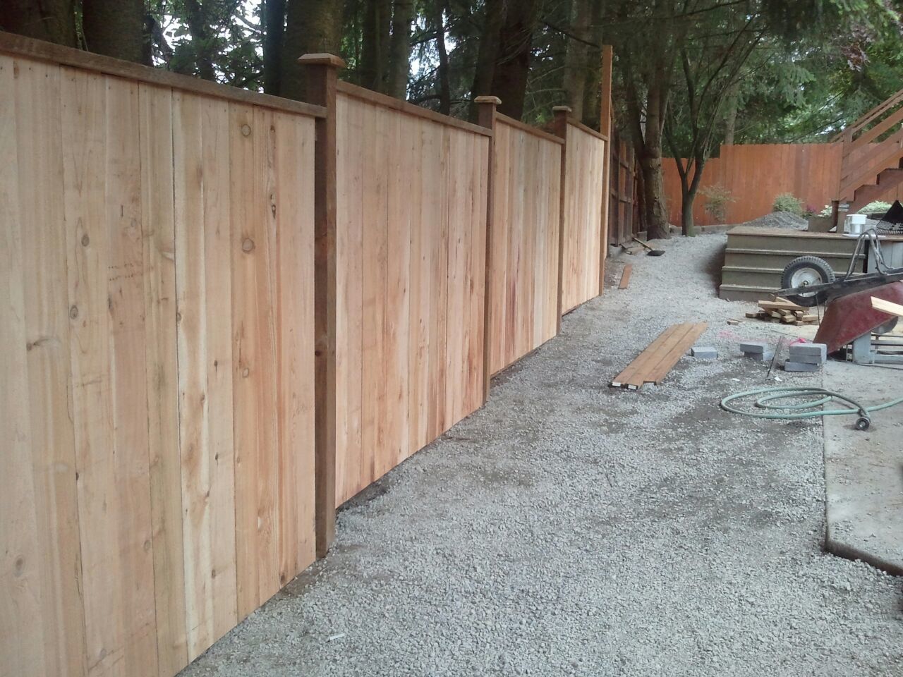 Here's what we started with - is it any wonder I wasn't feeling safe any longer? It was sufficient for years but couldn't stand up to 3 big dogs jumping on it, lunging at it, digging at it. Just beyond the wire fence is a small ledge that is our property. It drops down a small rock wall into the neighbors yard. But there is nothing preventing them from jumping up onto our ledge. I'm still trying to convince them they need a fence on their property.
