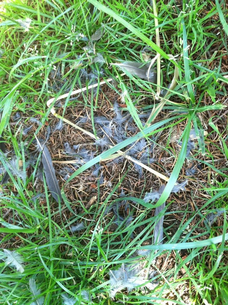 I need to pick your brains. My girls are 10.5 weeks old right now and at about 8.5 weeks we switched them from Purina Start & Grow to Scratch & Peck Grower. I *feel* (but don't really have much proof other than a few feathers) like that feed isn't good for them but I also don't want to switch again. It's supposed to be the best right?!?! I mean...it's whole grains, non-GMO, locally grown and milled, yada yada. But lately in the morning there have been a TON of feathers in the bottom of the coop, and today I found this spot on the grass!:
