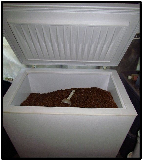 Have I told you all how I store my chickens' feed? I'm so excited! About a month ago I picked up 2 different sizes of THESE plastic storage vaults, the largest one and one of the smaller ones. They.are.awesome! The largest one (pricey, but worth it, it's airtight and watertight) I just found out today holds ***80***lbs (YES! 80 POUNDS!) of Scratch
