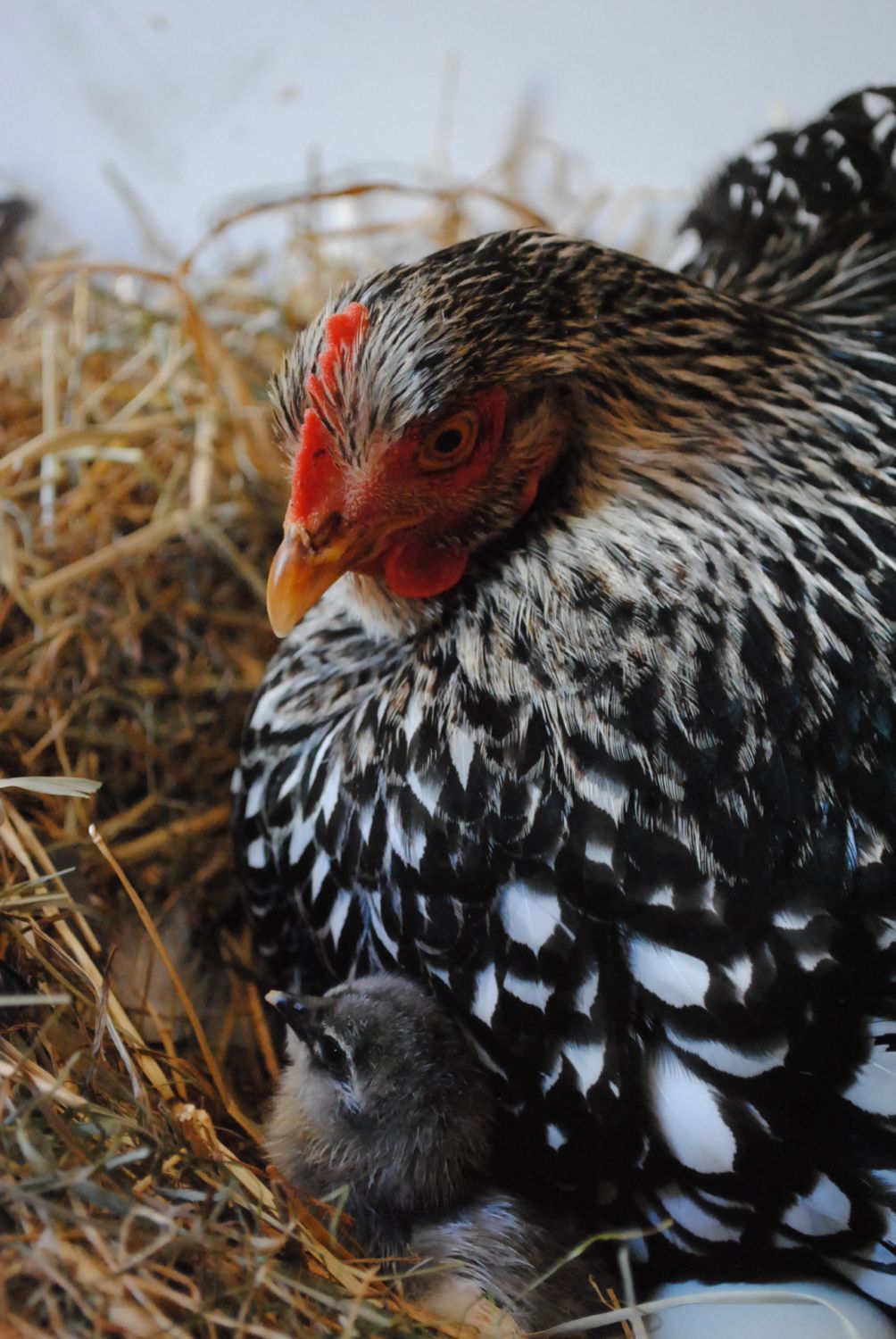 Newly hatched chick behind her.