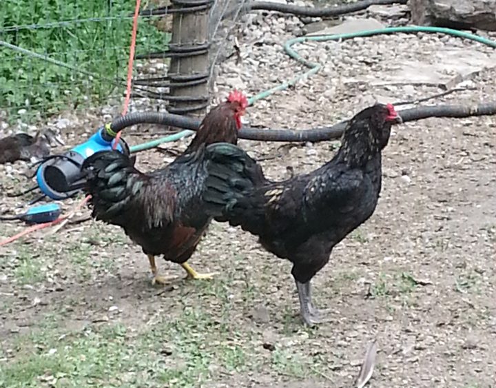 Duncan on the left, (tall, leggy Marans/Ameraucana/Cornish) and