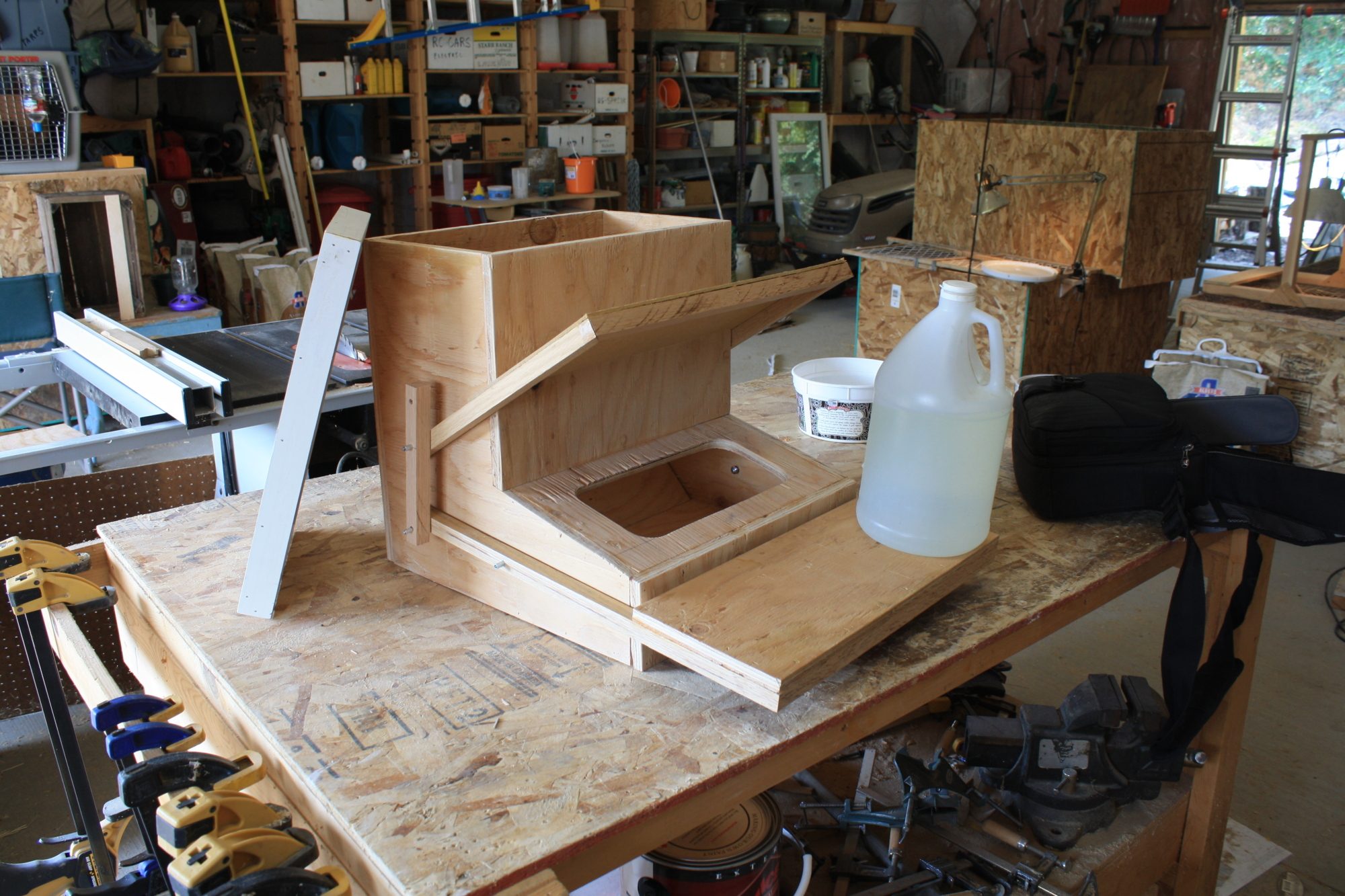 The feeder is 16" high (not counting the lid) and it's footprint is 16x16". It's big! Almost too big maybe. It should hold close to 40# of feed. As you can see it takes about 6 lbs. (3/4 of a gal) to open the lid. That's too much weight. So I'll have to fiddle around with the lifting mechanism. Future models will use lighter weight arms (I used quarter-sawn oak 3/4" square), and will be a big longer. I used a piece of masonite for the lid - I think that's too flimsy, I will use 1/4" plywood next. I also built this out of the plywood I hard on hand already. I could reduce the overall weight of the feeder (~20#) if I use thinner plywood. I can change the lid up a bit and drop a bit of weight there as well.