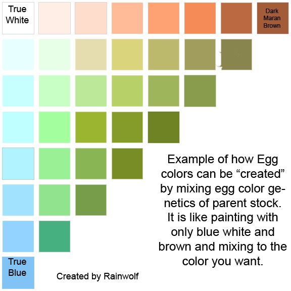 Rainwolf, thanks for the chart; I have EEs that lay the lightest two pinks (one hen, they vary a lot day to day), the third down in the blue column (unfortunately that hen lays eggs with no outer layer, so I doubt they'd hatch) and the second and third in the first row of greens (again, one hen). One of the Hamburgs occassionally throws an egg which can be confused with the palest pink; the Australorp lays big eggs of the second most intense brown, and the two BLRWs who are dependable layers put out eggs that range up and down the brown scale from 1-5.