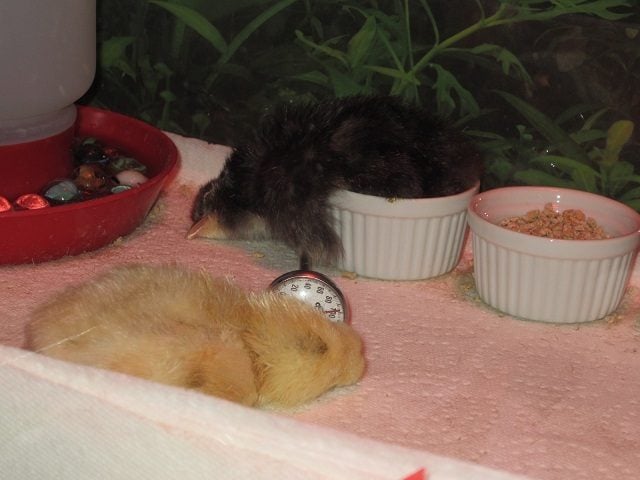 Below... "Fuzzy" - 2nd to hatch must be missing his/her egg. Gonna make it difficult to eat out of that dish. "Softie," the yellow chick, sacked out under the heat lamp.