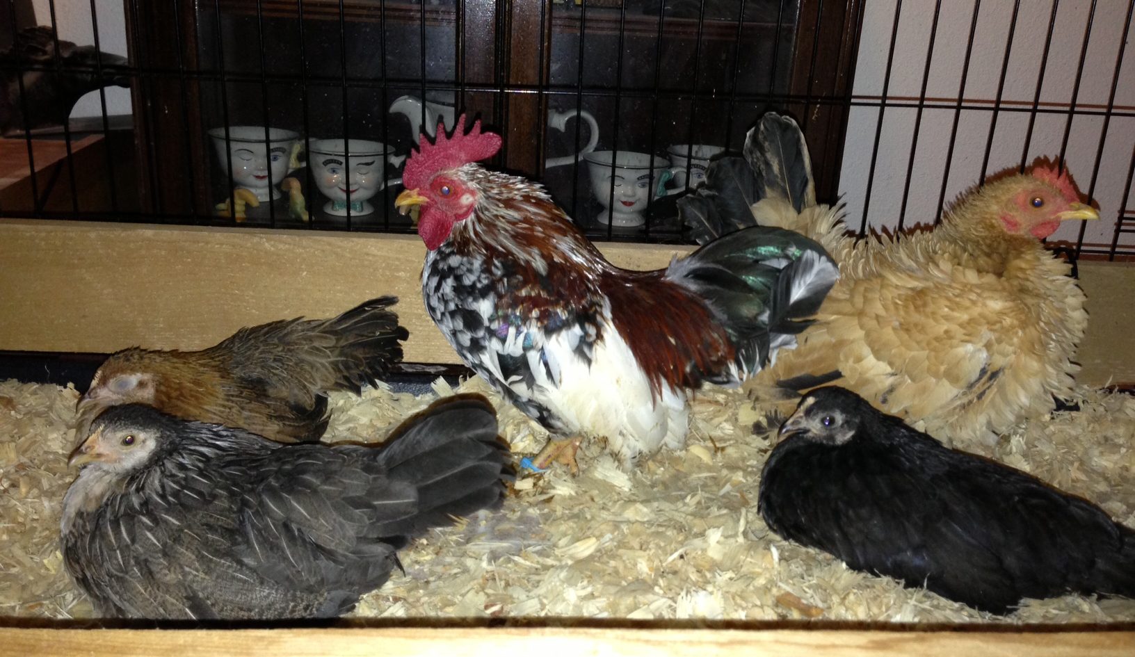 Here's a quick photo I took with my phone the other night when I moved them in altogether. The babies were settling down, they all make this sweet trilling, purring sound as they settle in for the night, and the little roo was standing watch.