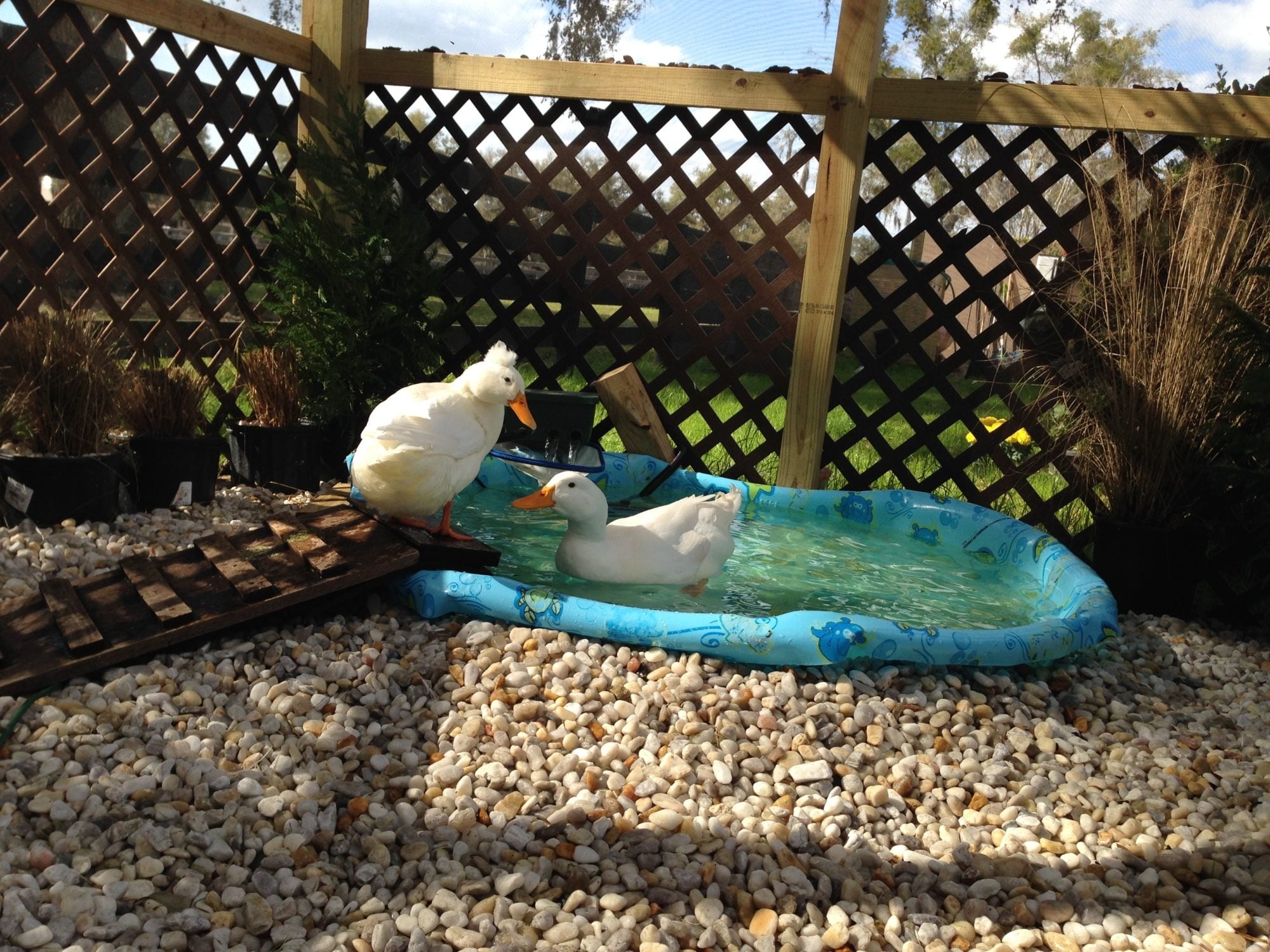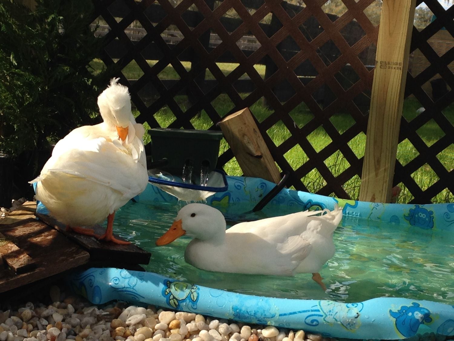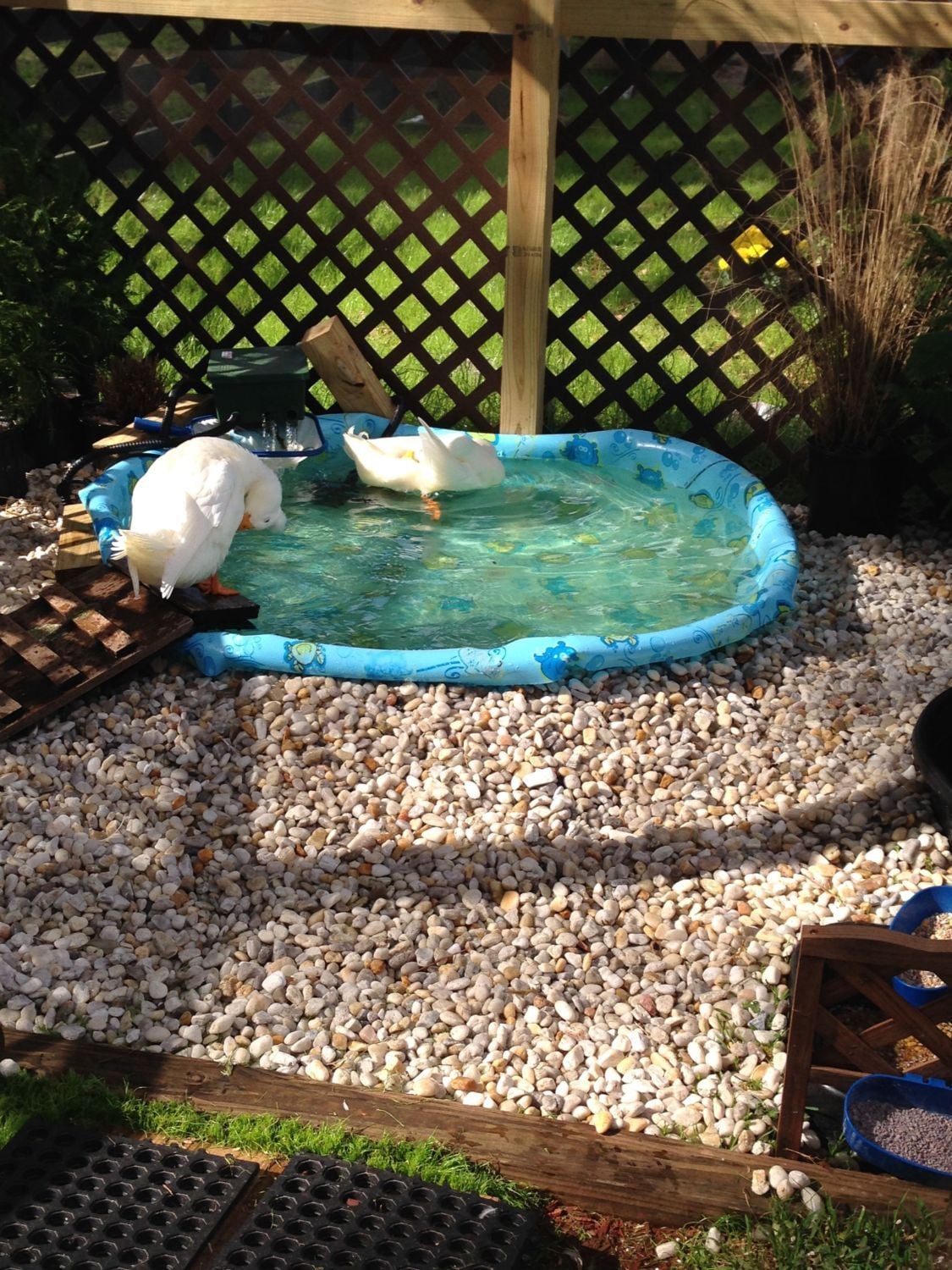 My 2 month Pekin (being raised by a very maternal Silkie chicken hen) is suddenly all about hanging out in the water dish. So I know I need to provide her with some kind of small body of water that she can play in. What do those of you with backyard ducks recommend for this? It needs to be something I can empty frequently and relatively easily because I know it will get nasty, fast, and it also needs to be something she can get into and out of without much trouble. A plastic toddler pool seems like it could work but would I need to stack some stones or bricks to make steps for her to get in and out? How often do those of you with Pekins notice your ducks hanging out/playing in the water that you provide? Thanks!