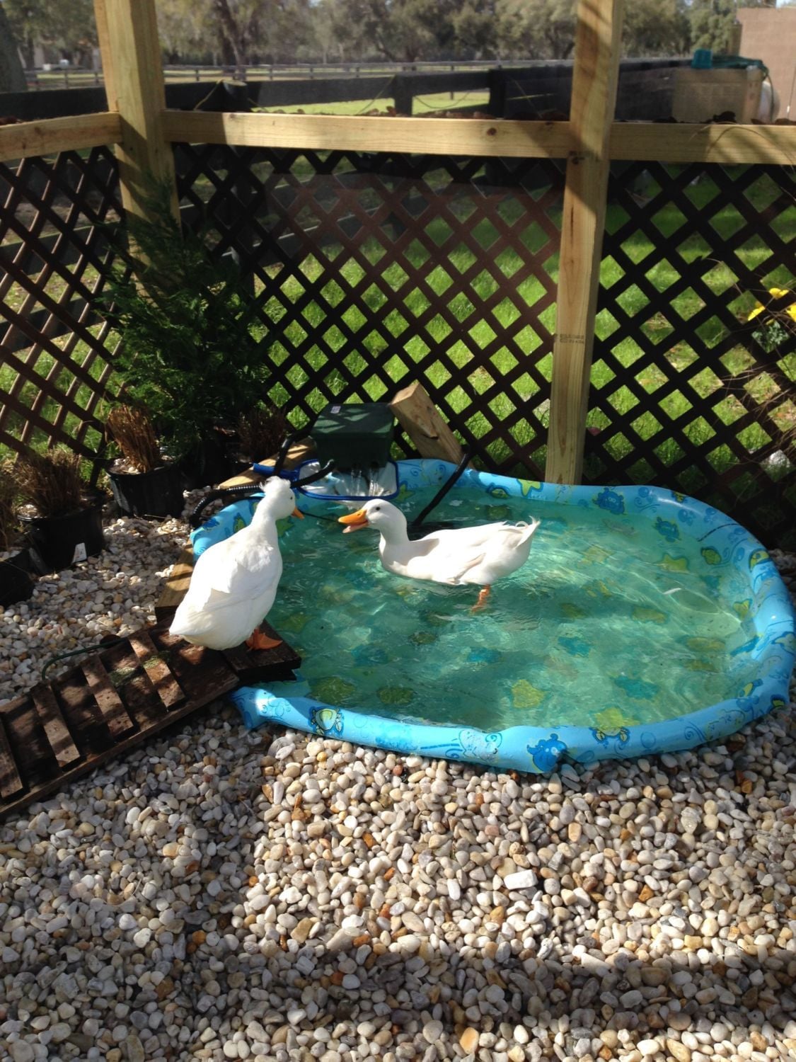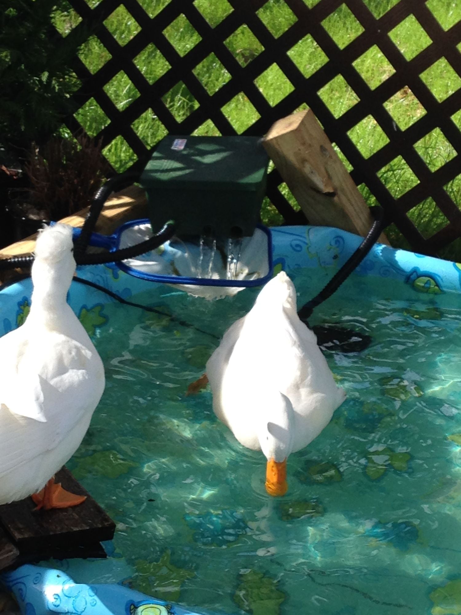 Hey - Have a pair - Drake Pekin and Crested Hen - They spend about 75% of the day in the water and if they could would probably sleep in their pool ... Cleaning it out is really important - before my current set-up - I would have to empty it every other day because it got pretty nasty. I spent a lot of time cleaning it (I can't just dump - I have to pump- given their run setup) and it was annoying for them and me so I dug into my pocket. With some trial and error, I found a system that has worked pretty well for us.