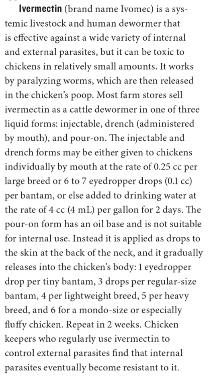 I found this online at: https://books.google.com/books?id=2...v=onepage&q=gail damerow fenbendazole&f=falseDoes anyone have a copy of Gale Damerow's Chicken Health Handbook? If so, can you check to see if it says that one can use Ivomec (ivermectin) at 4cc per gallon of water? If it does, that info is not correct, injectable ivermectin is not water soluble and will float to the top in minutes.