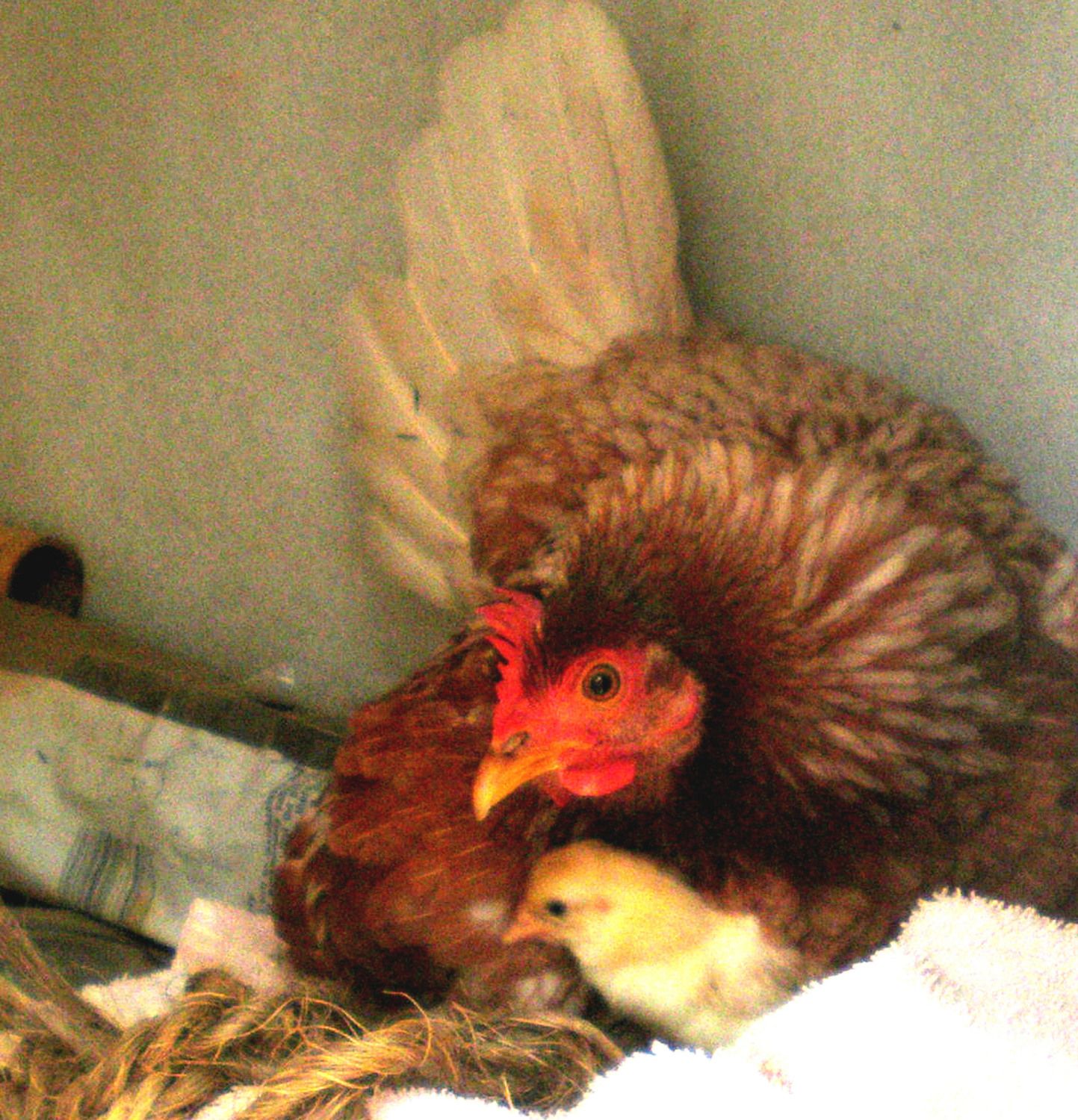 Above is a picture of the hen that started it all. She was the first to nest in our closet. She hatched 8 little blond chicks. While searching food in the vacant wooded area next to our property she was attacked by what I think was a mongoose. She fought hard and valiantly saved all her chicks but came away with a huge gash on the back of her head and spent the next couple of days very dazed. not knowing anything about chickens I searched the web and hooked up with Mary Britton Clouse of Chicken Run Rescue Minneapolis, MN. She was a great help. Momma hen and all her little ones came through the ordeal intact. She has a pretty large scar on the back of her head now but otherwise she's fine and still my favorite. Since then the wooded property next door has been cleared. Whatever predators were living there are gone. So nature has been altered and many more chicks are making it to adulthood than before.