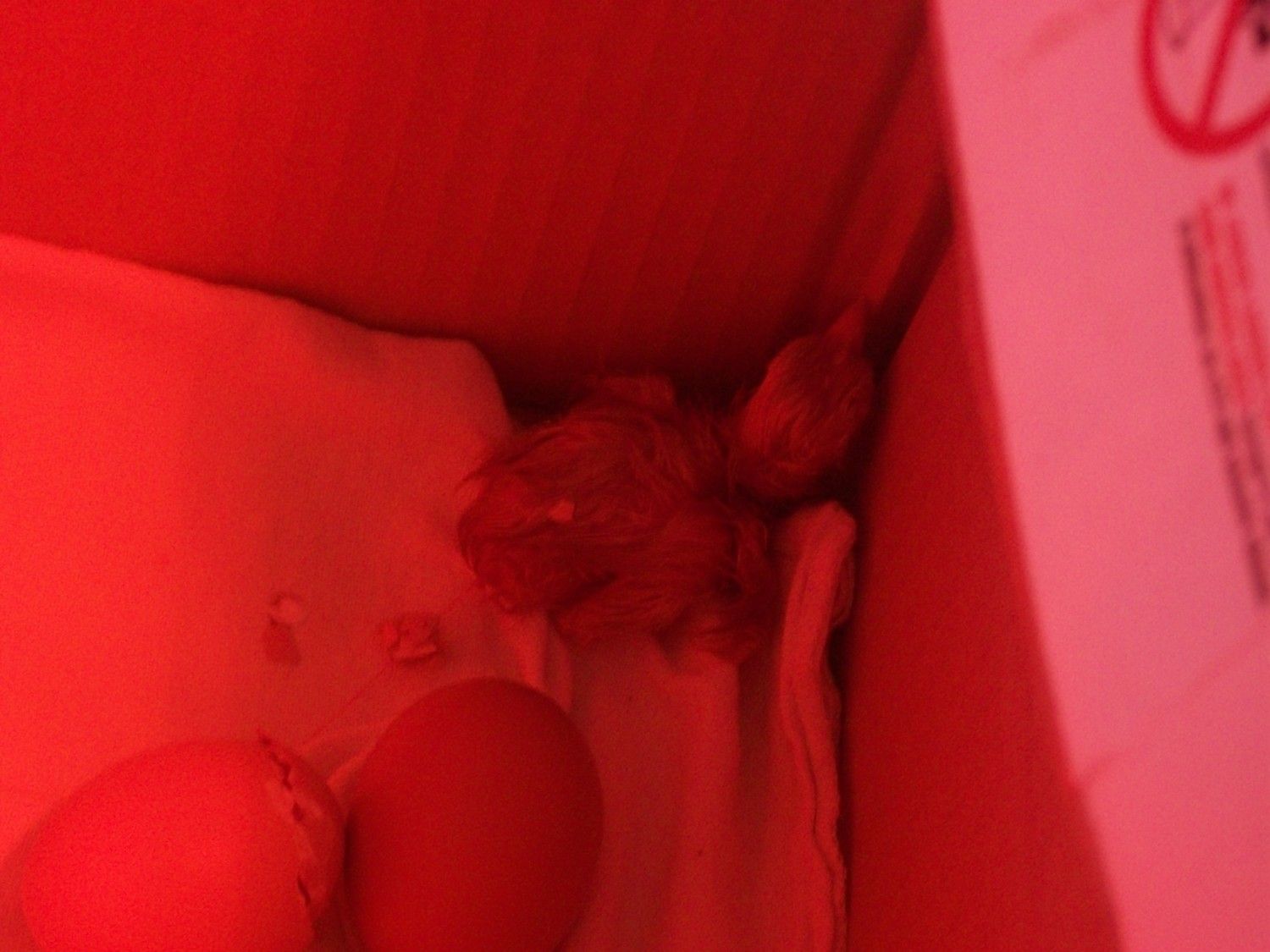 ur other eggs didn't hatch they died I think that is because the eggs were small so maybe they didn't have a chance. I will be pulling 8 more eggs from the incubator tomorrow so hopefully some will hatch on Wed. Can a chick die because it is lonely? Also One of our big chickens died today I'm guessing from the heat it reached 110 here in Kansas today. I changed their water and all was fine then about 2hrs later my son went out and came in and said one was dead and sure enough she was there on the floor. Could she have smothered herself with dirt trying to stay cool she had dirt in her nose? Everyone else was doing fine.Here is a picture of July not to long after she hatched.