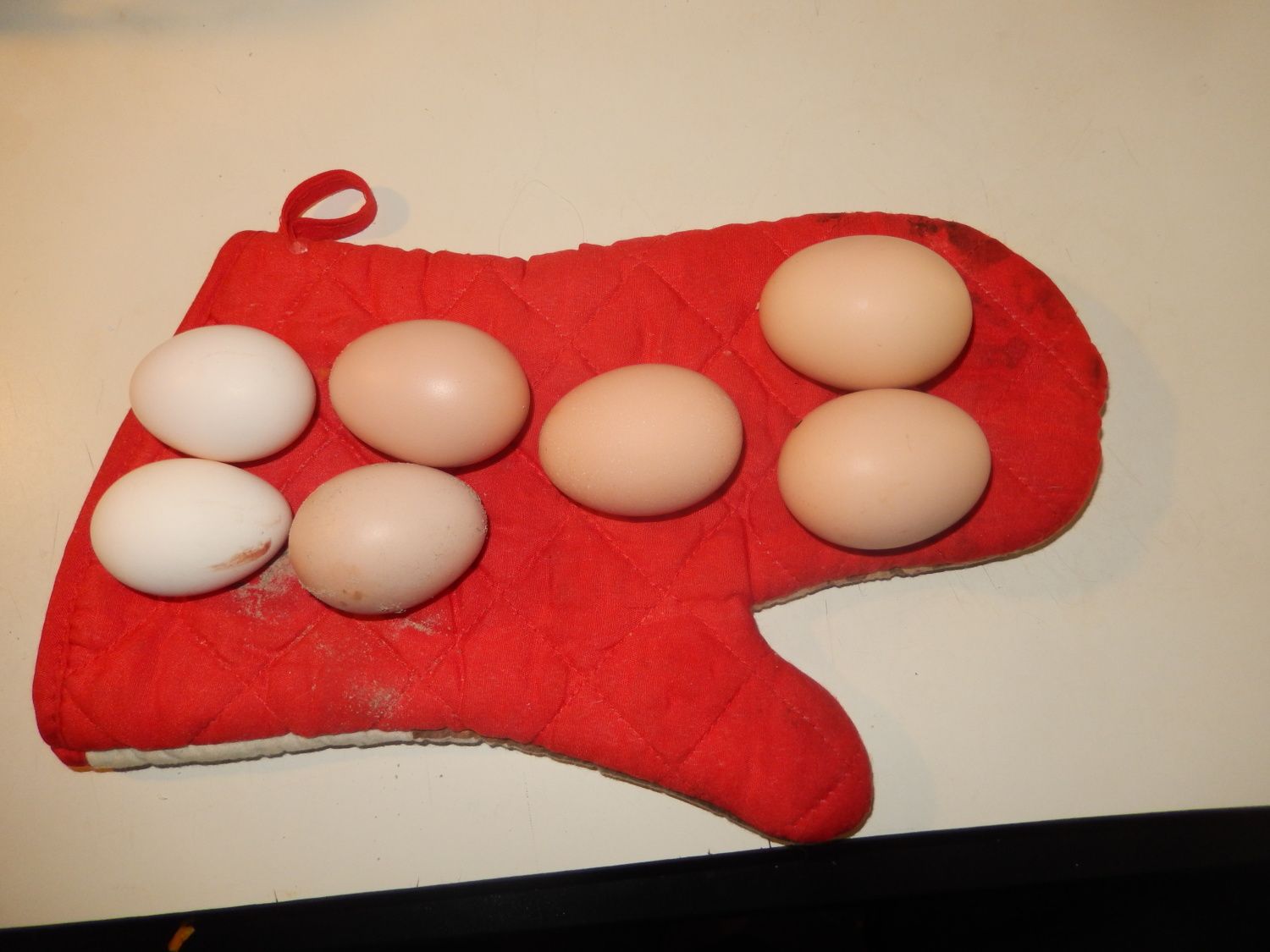 On the left we have 2 Silkie eggs, the next two are Black Australorp (which belong to my sister-in-law), then the 3 on the right are Rhode Island Reds.
