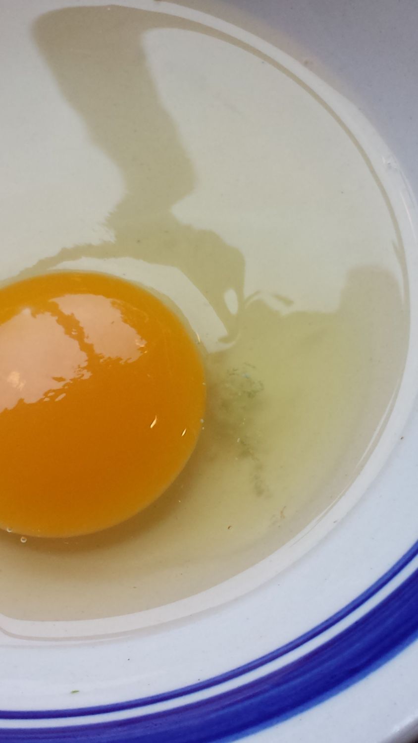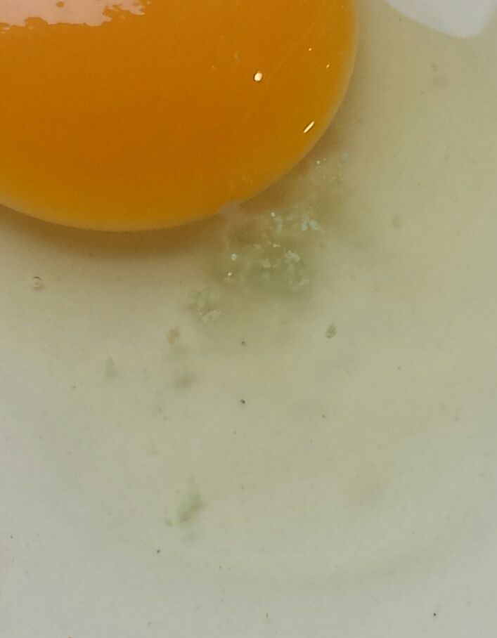I brought in a egg from my coop this morning and cracked it open for my breakfast. It was from one of my easter egger hens and there was some weird debris attached to the yolk. It was green and looked hard/lumpy. The egg itself was green and I wondered if it was a calcium deposit of some kind. I've had chickens for a few years and I've never seen this before. Any idea of what it could be? Just to be safe, I threw the egg out and didn't eat it.
