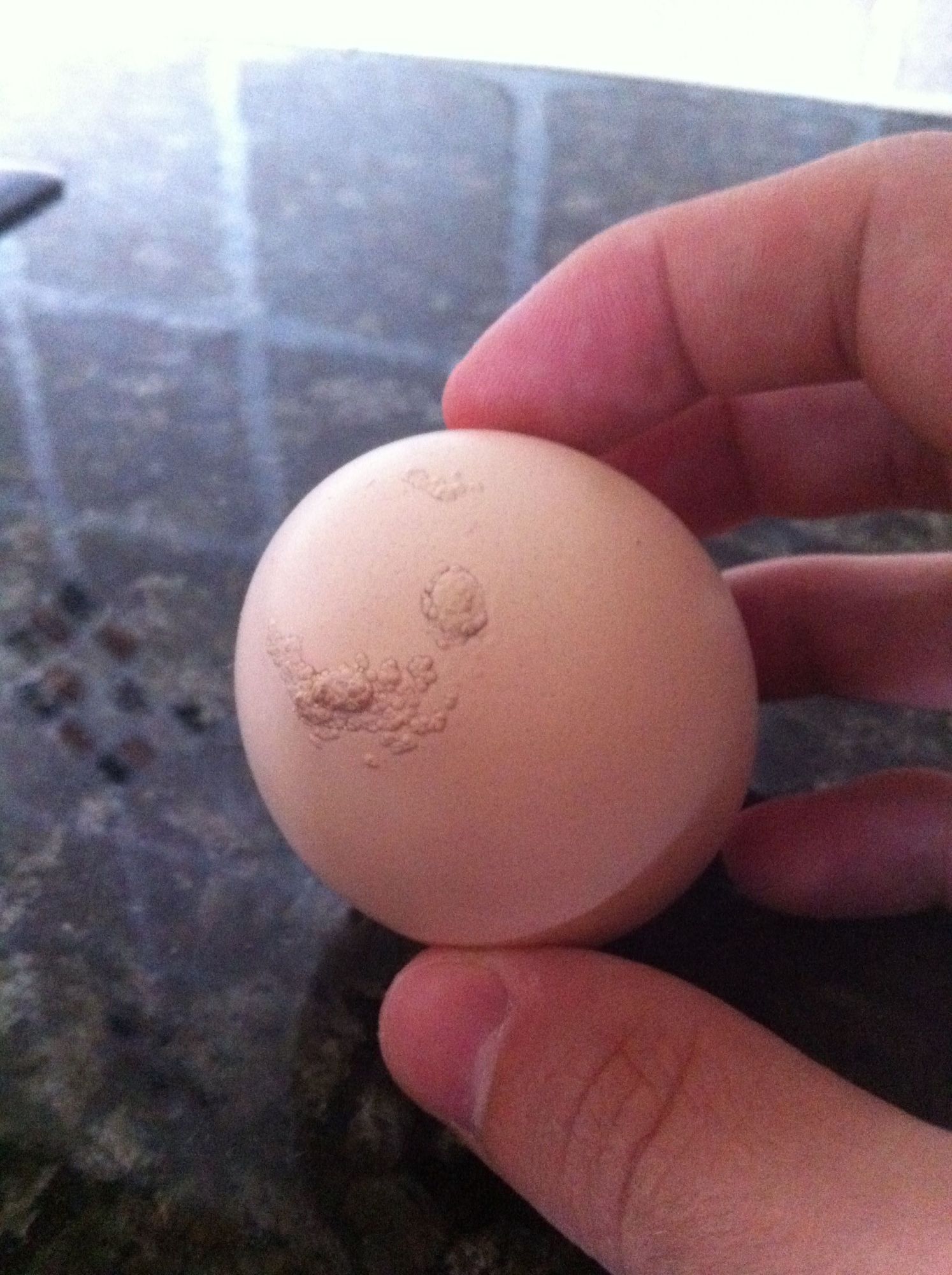 Her strange speckled egg next to one of her normal eggs. The weird thing is that those spots washed off. >.< not sure what's up with that! I have my fingers crossed that her normal eggs will come back :)