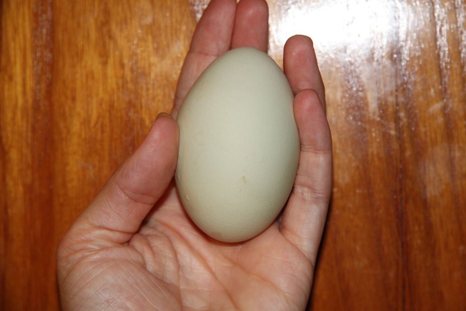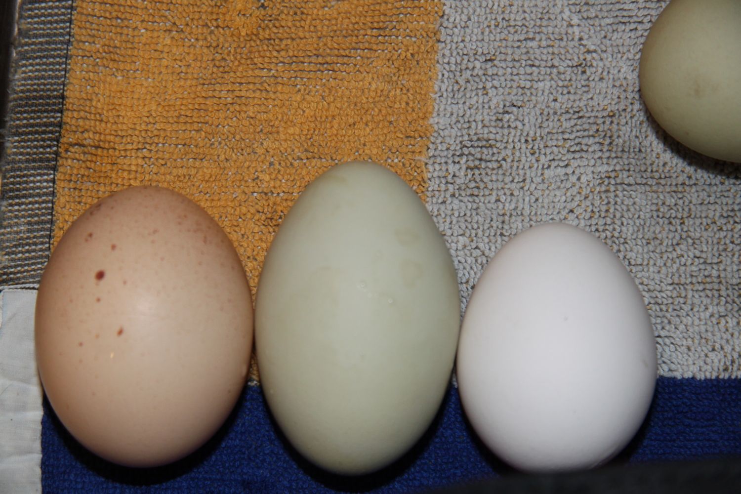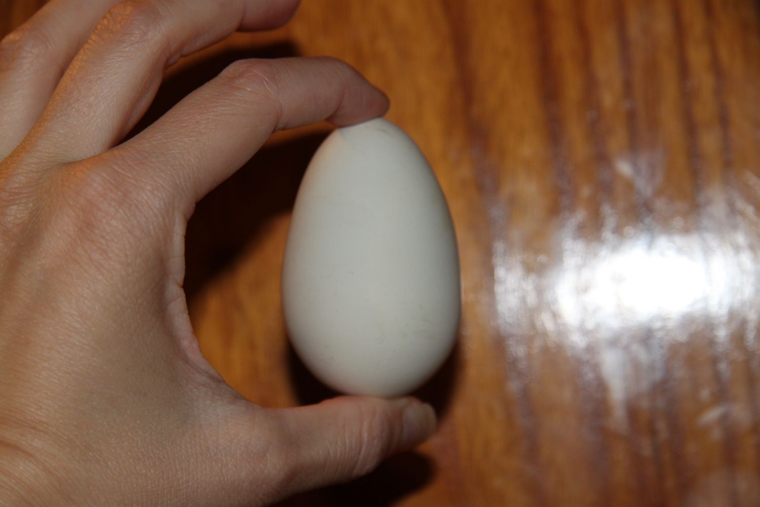 Here it is pictured in the middle with a "normal" sized egg on the right and one of our "jumbo" eggs on the left for comparison. I haven't yet tried to put this monster in an egg carton so I don't even know if it will fit.