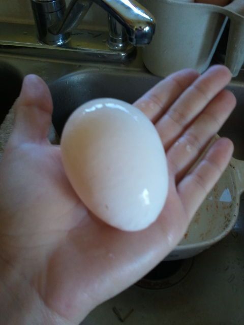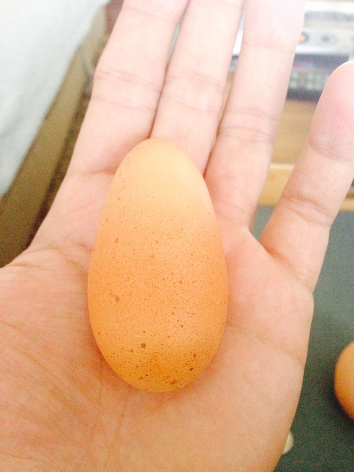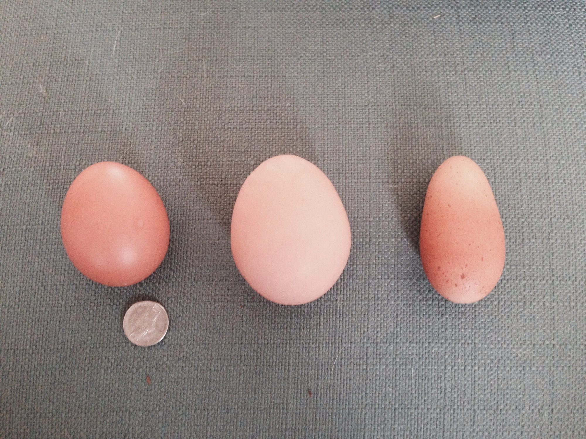 On the left is a normal one we get, the middle is our 3rd double yolk and the one on the far right is an odd cone shaped one. Super narrow, kind of comical.![]()