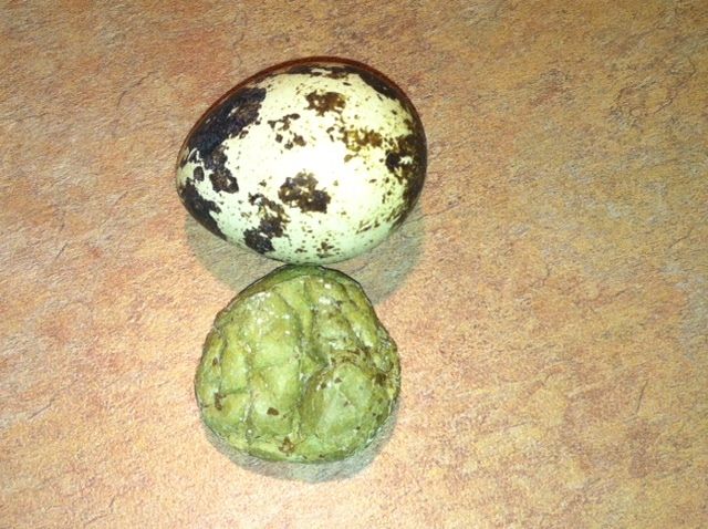 Quail are not immune to weird eggs. For some reason I got a lot of eggs today: 18 eggs out of 16 quail-- and then this! It even has spots. Not quite a soft shelled egg but not hard either. My quail get great feed and plenty of calcium. This was just a fluke.