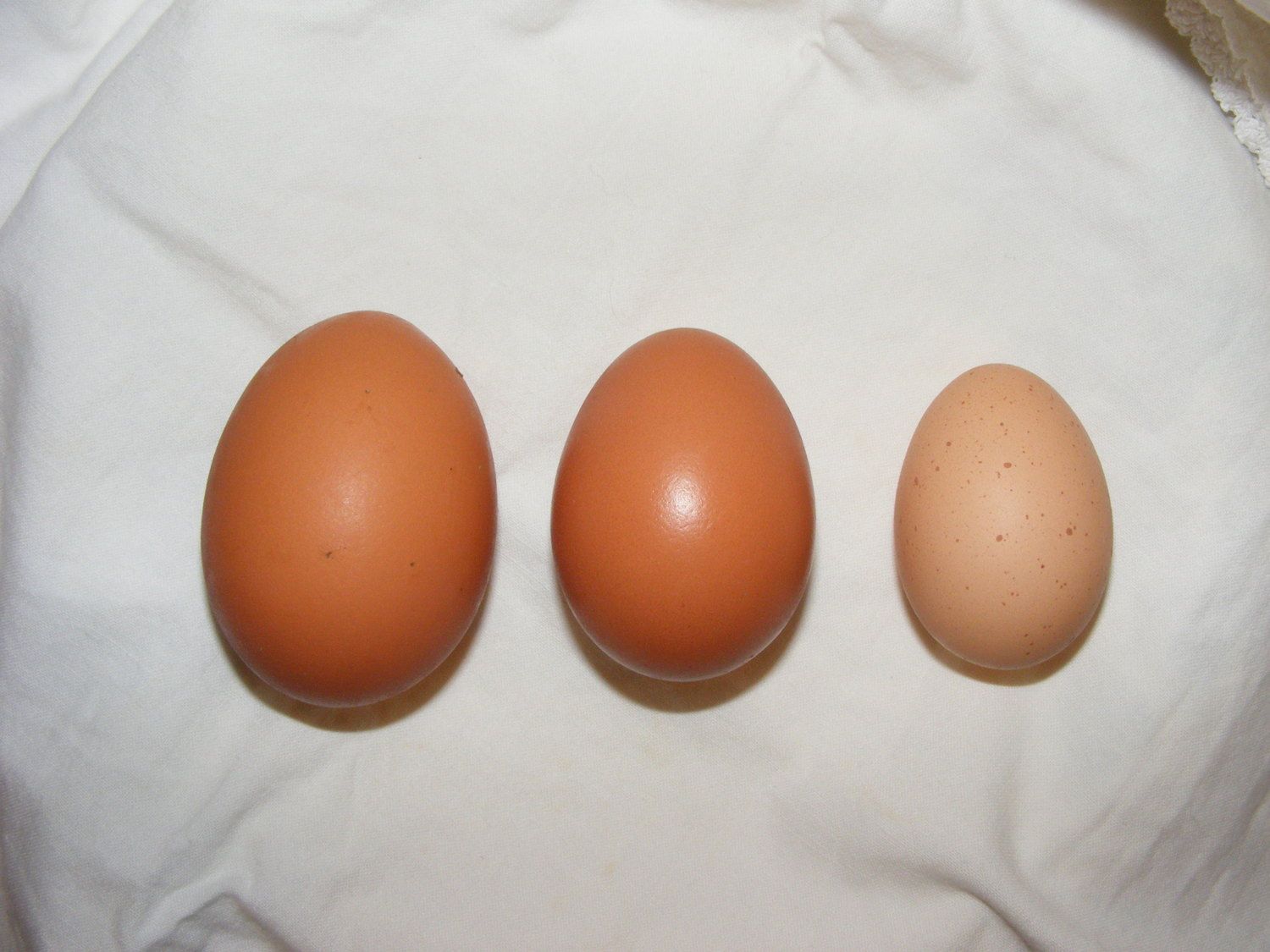 Here's a photo, taken in early 2012. The eggs aren't particularly unusual, but I found the size discrepancy amusing.