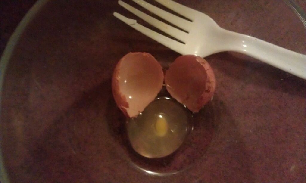 2. Yesterday, I got what I think was my first "fart egg" --very small (DB thought maybe it was a bird's egg, not a chicken's), like a grape, or an acorn. My son's friend was really interested, so I told them I'd only open it when they were both there to see it (as long as he didn't skip class again to come over). But all yesterday's eggs were very muddy, so I caved to the other half's wishes and soaked/rinsed them all off. In the process, the little egg broke in half. I quickly got it into a clear bowl, and snapped a picture to text to him: