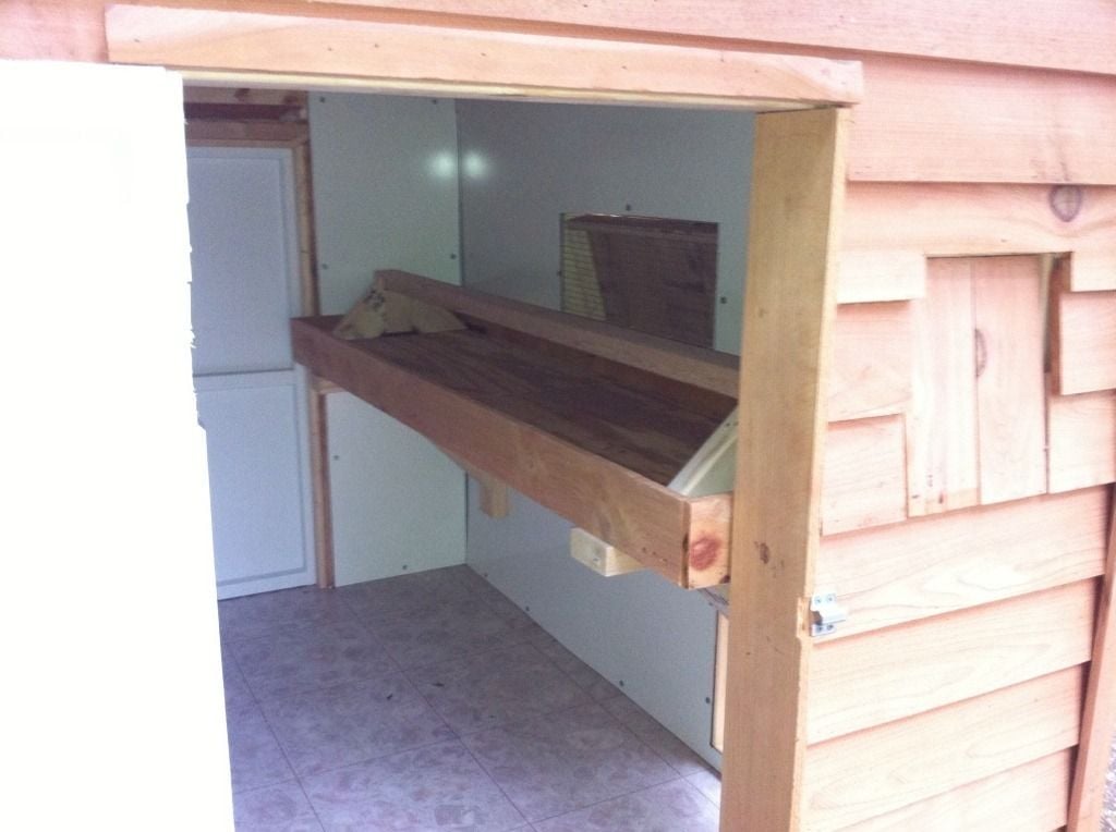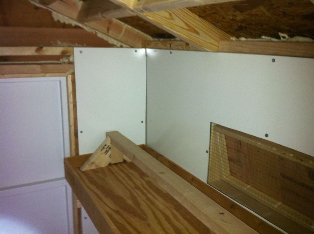 It's not attached. I am going to redesign it tonight. To me it's too low and I don't like the supports being in the pan itself. I think I'll try bringing the supports down from the rafters. Thanks for the reply.Probably be ok...but looks like you could mount the roost part up a bit higher on the angle parts...can't tell if you used nails or screws, I always use screws so I can change things much easier if need be.