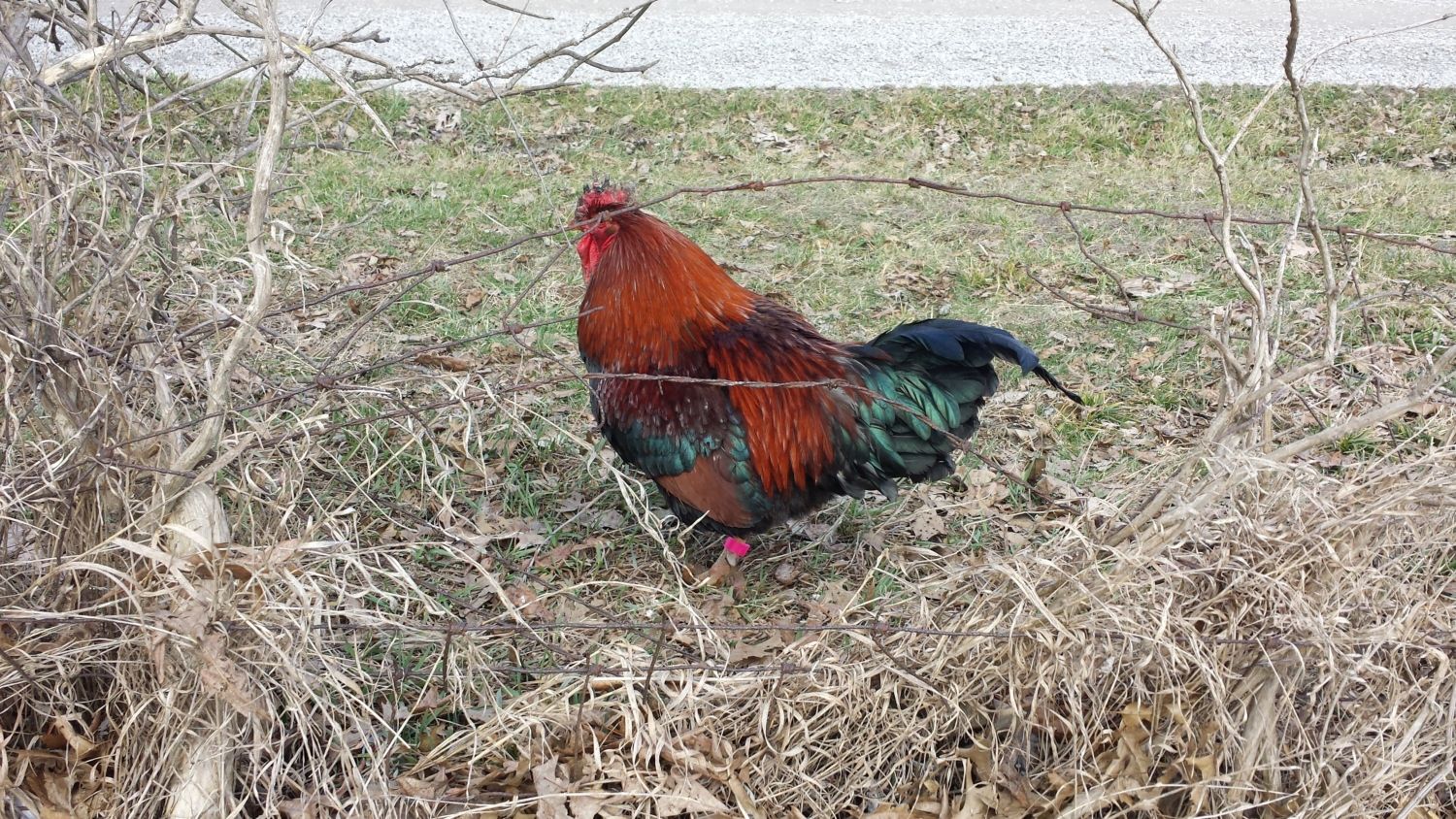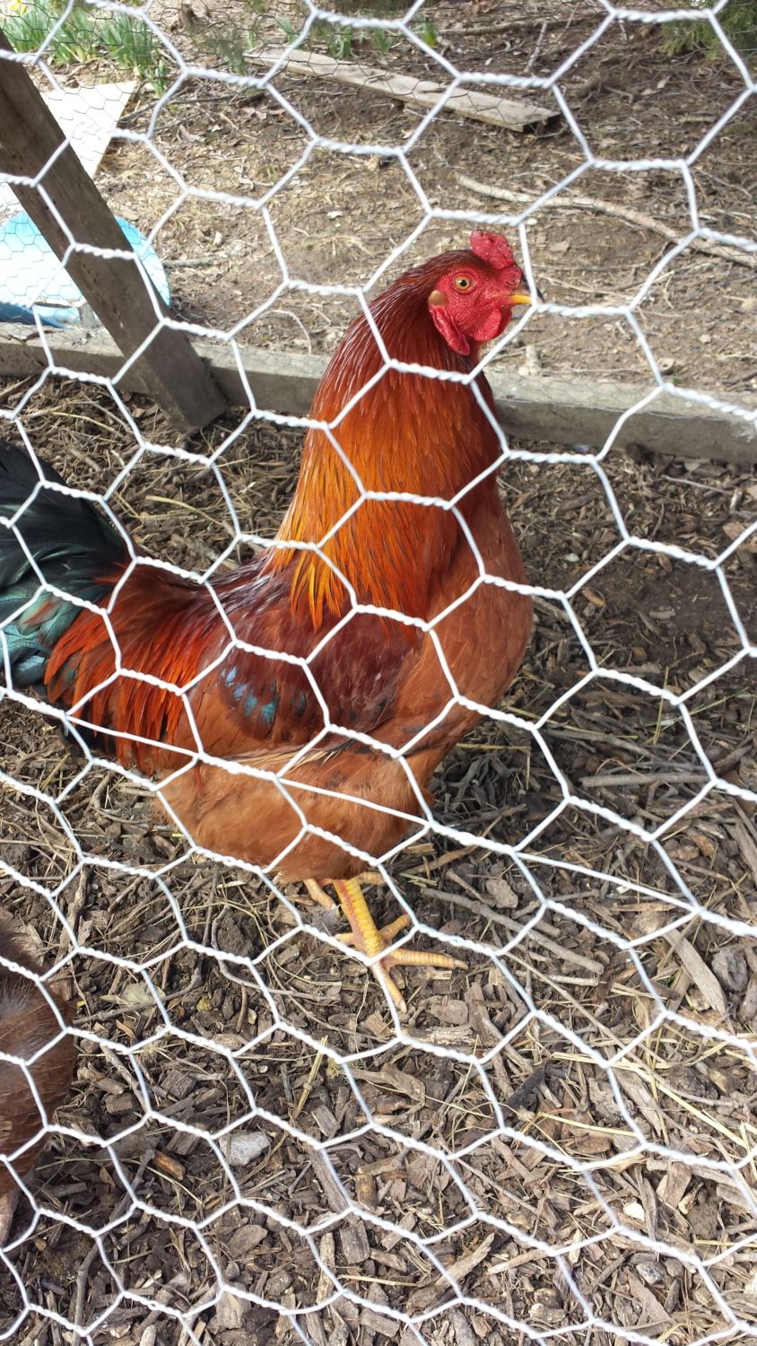 A Rhode Island Red rooster is a solid red/mahogany color. A Wellie has a black breast and colored wings.