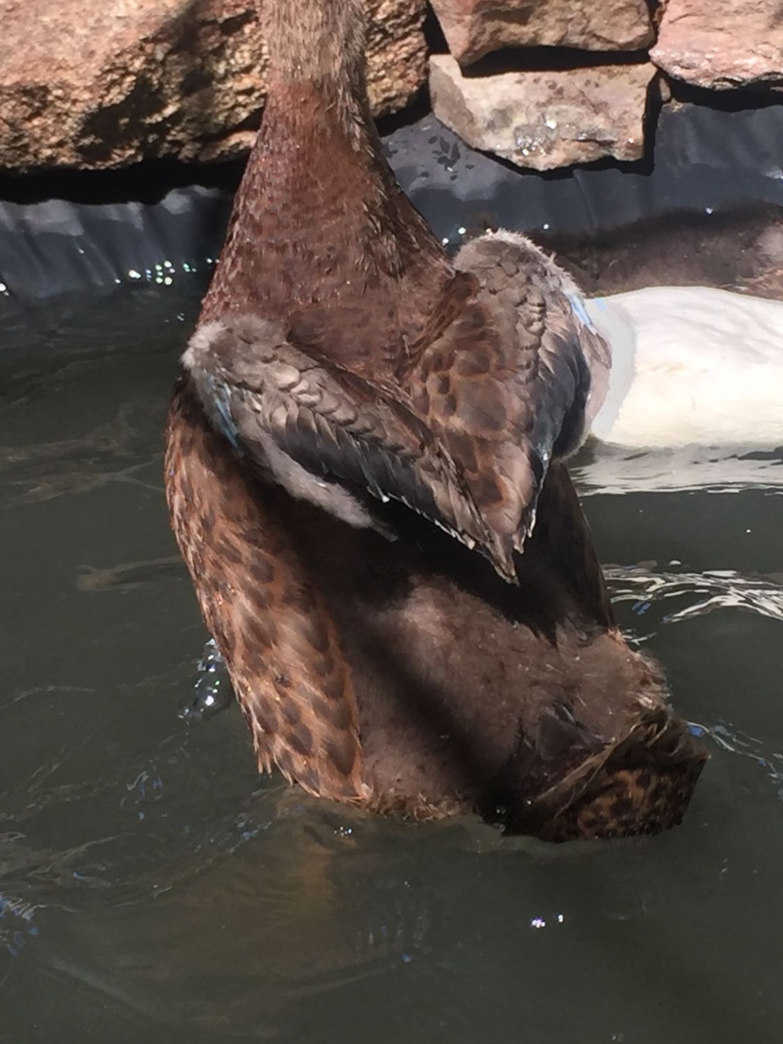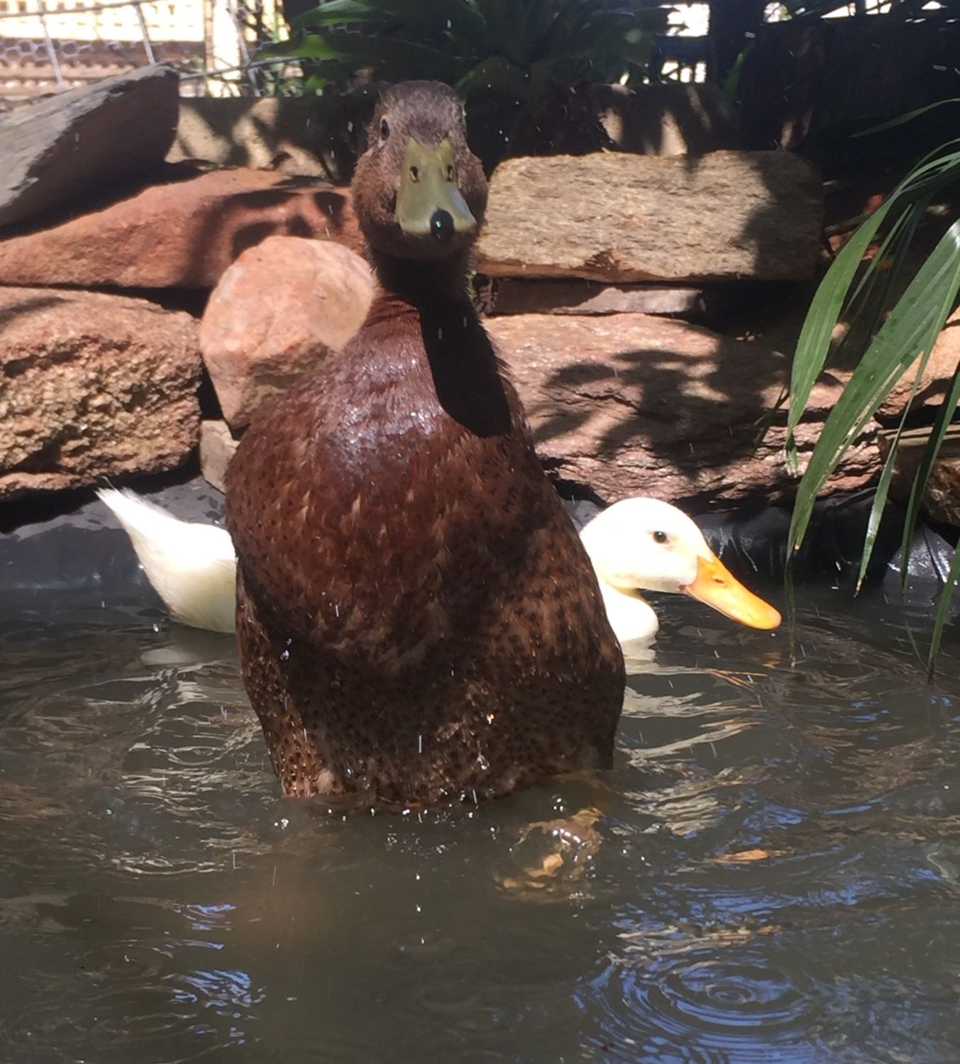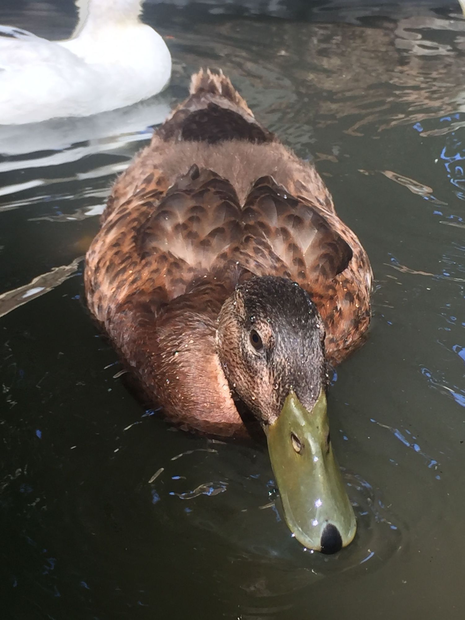 The one that looks mallard-y is just this gorgeous chocolatey brown colour on the chest and his head is much lighter than the rest of him. His beak has gone green and his legs are now orange. I have no idea what this duck is at all haha.