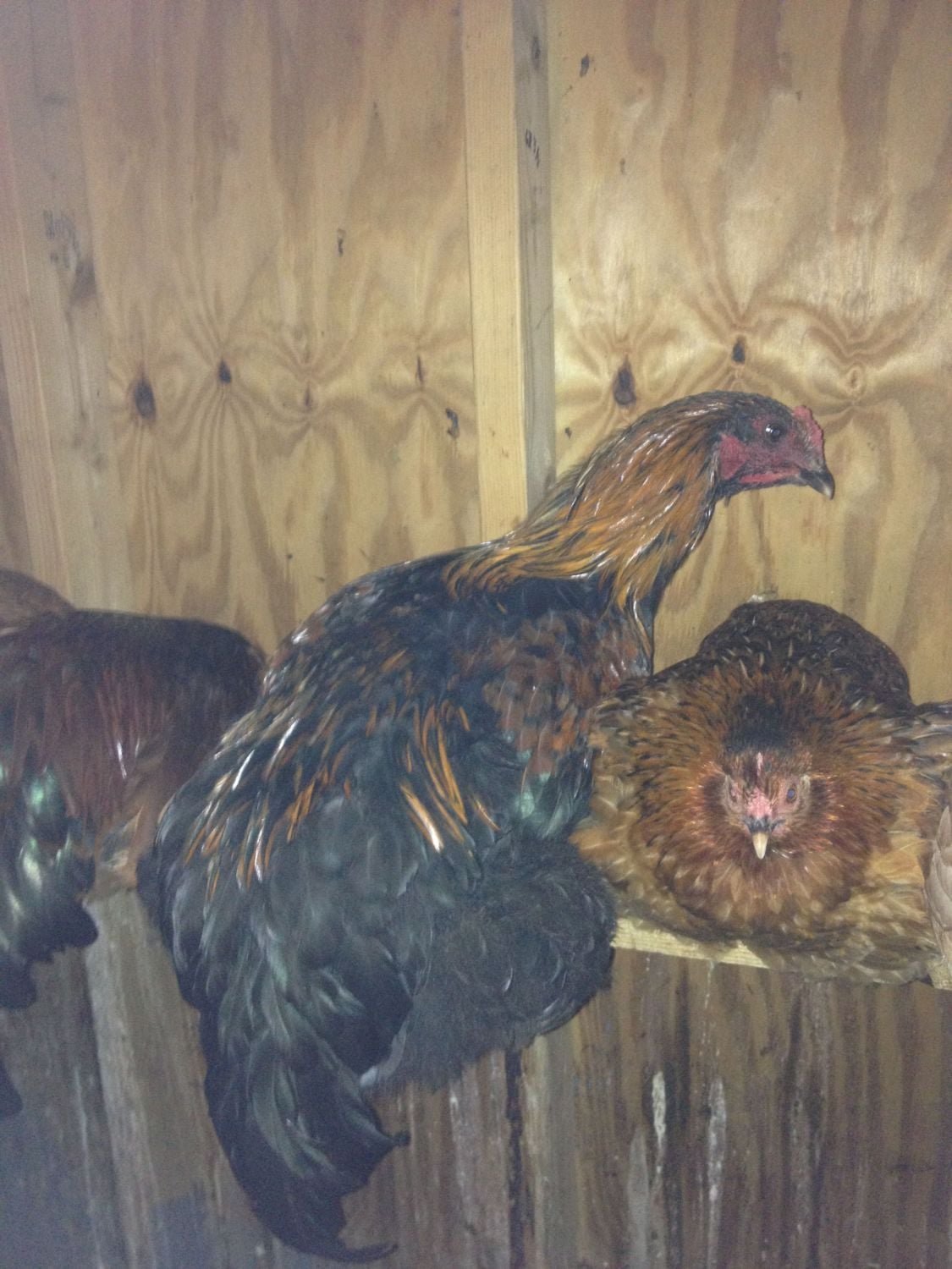 I know this isnt the best picture, but maybe for the purpose it will be fine. I thought this was a hen, but then noticed "her" feathers starting looking like she was in fact a he. "she has a rose comb so I cant tell that way. No sign of spurs (yet "she is still young just 6 months old) But in the last month or so her feathers started getting shinny like a roo, and her tail feathers grew out in the way a roo's grow. She doesnt crow, gets along just fine with the other roo who is much smaller than her ~ the other one is a bantom roo. As you might be able to see, the other roo is next to her also facing backwards. Her Dad was a HUGE RIR, and Im guessing her Mom is a cross between a barred and RIR (she is solid black with a rose comb). I have heard of Roo's having Hen feathers ~ is it possible for a Hen to have Roo feathers? Im looking for another pic that I have while she is outside free ranging if another pic is neeed. Thanks for your thoughts.