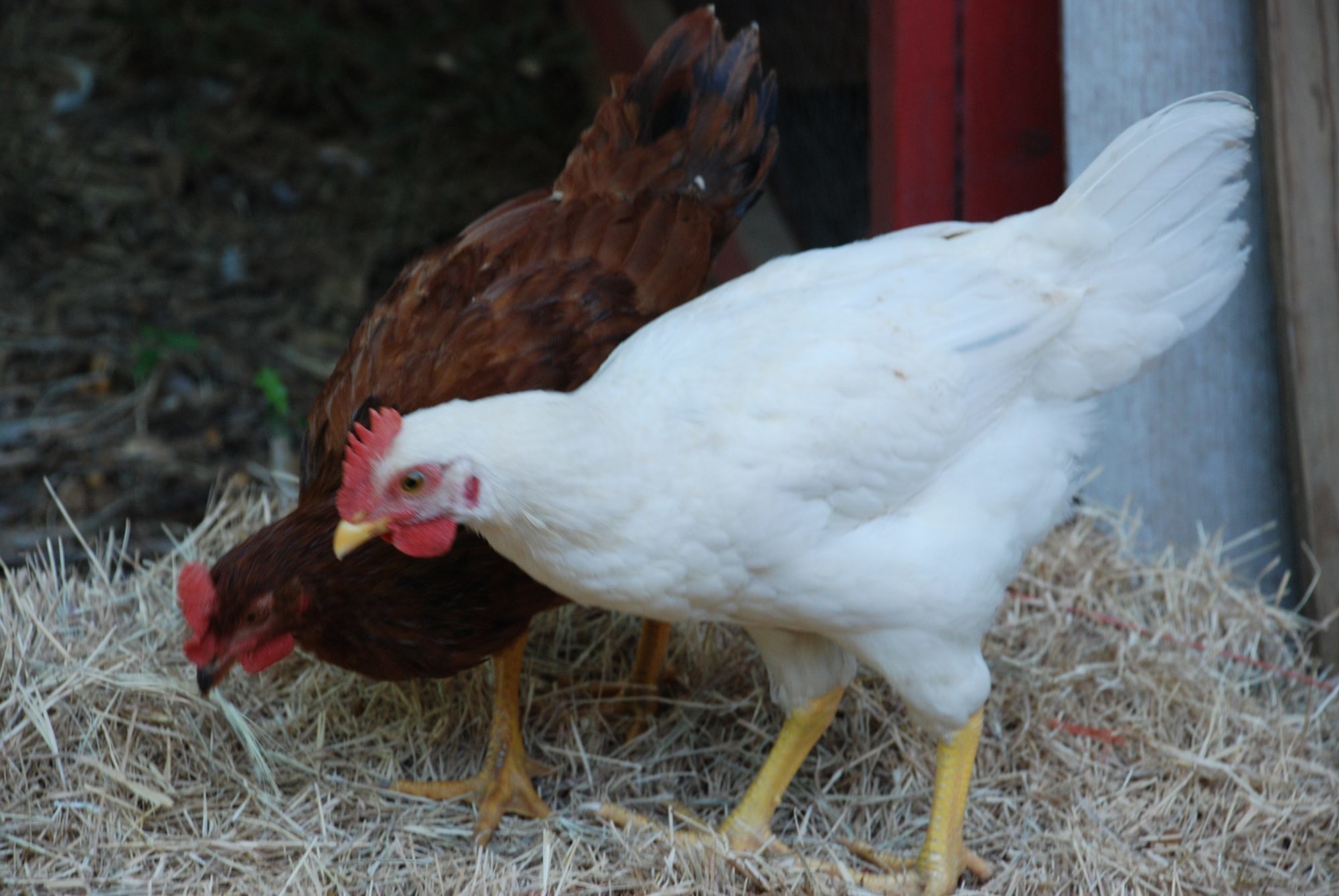 Are there any colors on your white chicken besides white? I think I see a color spot, but it's hard to tell if it's dirt or not. It's too heavy-framed for a Leghorn (plus has red, not white ears), but too light for a Rock. Hrm... I'd say this is a Tetra-tint (common name for a hatchery egg-laying hybrid).
