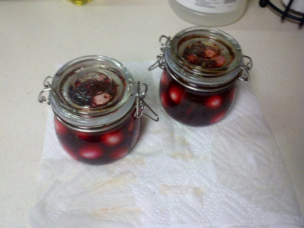 the pickled eggs, there are some great recipes around, I used Dirk's recipe posted around here somewhere with some added beet juice for the coloring.