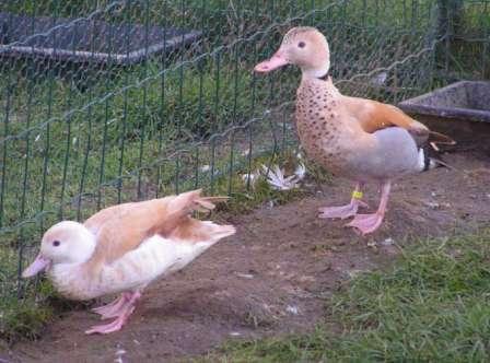 i was given 2 couples this weekend..one look like the top couple, the others look like the bottom couple. i was told they were roodschoudertalings ((1 wild colour couple, 1 blonde couple) but i dont know what the english translation is? can anyone help me out please? (these photos are from the internet i'll get phtots up of mine asap!) i was also given 2 couples of white ducks, and judging by the noise they make id say they must be call ducks? they look like these (hollandse kwakers they are called here)
