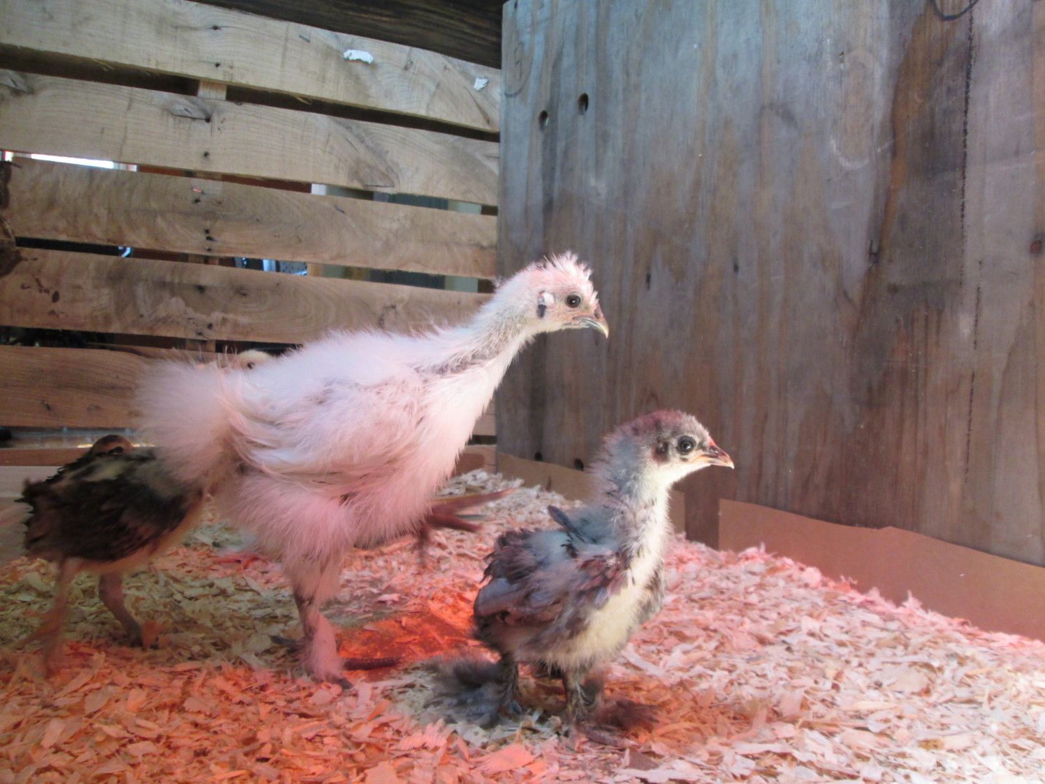 The big white one is about a week older than the rest. I'm thinking Silkie for that one, but have no clue on the rest.