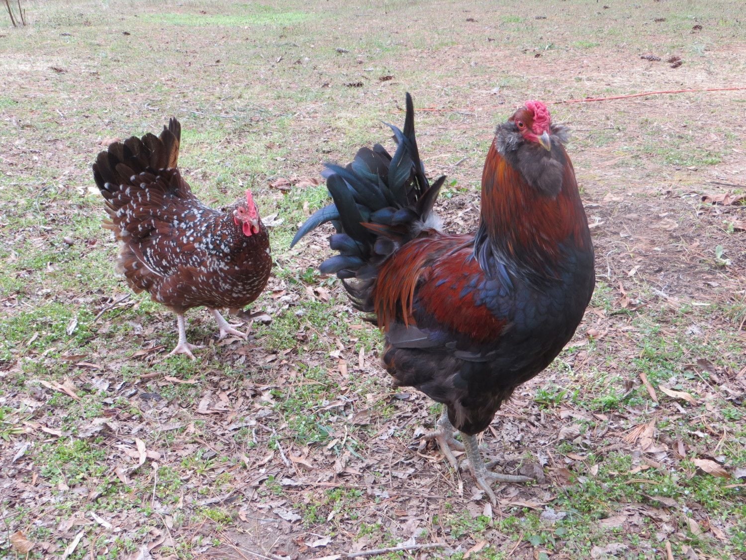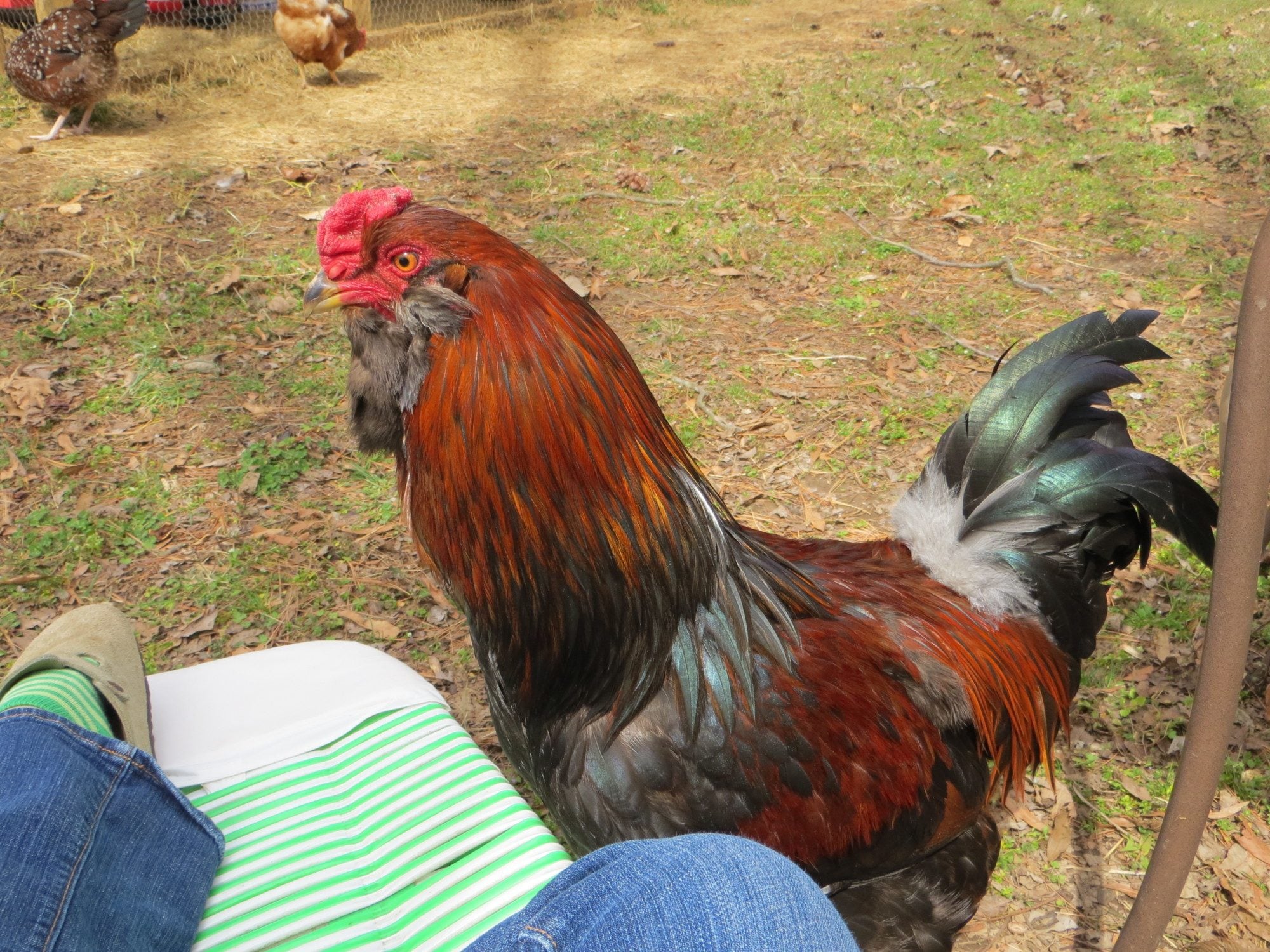 I have 4 that I know of so far: Schmoe (My hubby's nickname. I told him we'd name our first rooster after him), Jerry (after my f-i-l, since I have a hen named Rosemary after my m-i-l), Zeus and Marty. As for what kind they are I do not know, I bought them from a local farmer.