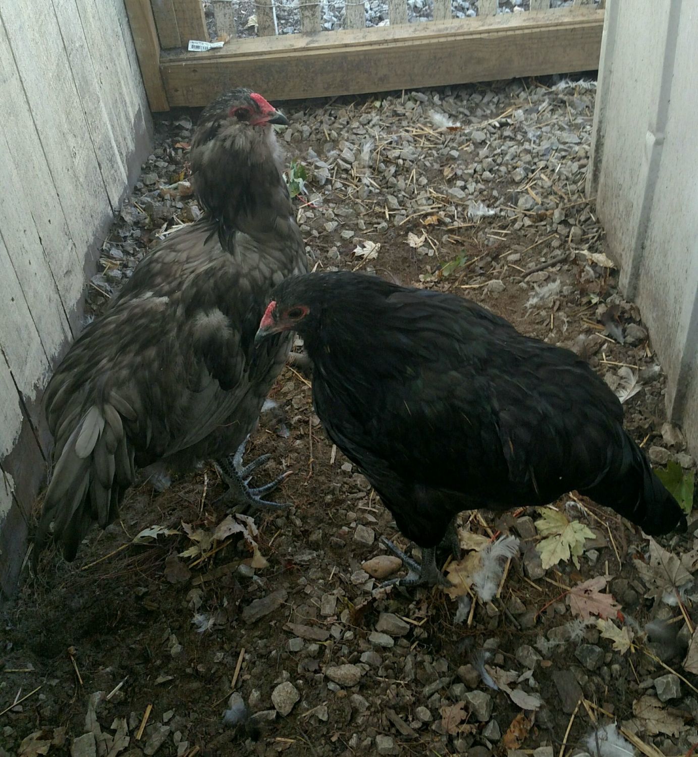 The black one on the right I think is an ameraucana (at least the people I got her/him from told me that and I saw the mom and dad they were beautiful black Ameraucana think both have same daddy) Hot Chocolate is about 21 or 22 weeks old.