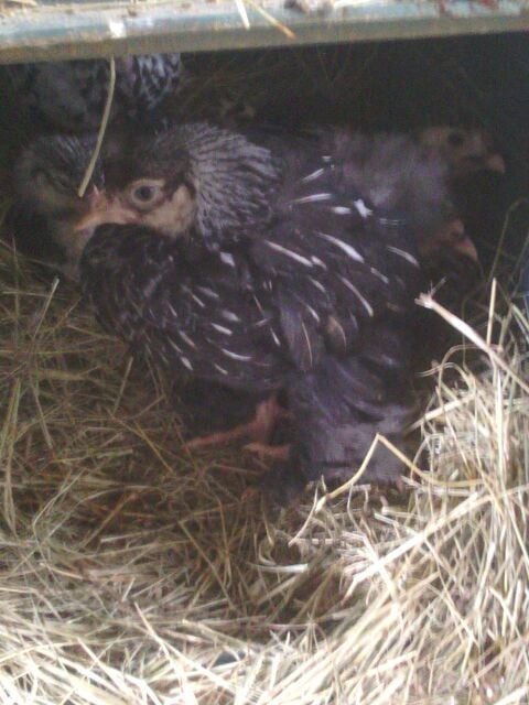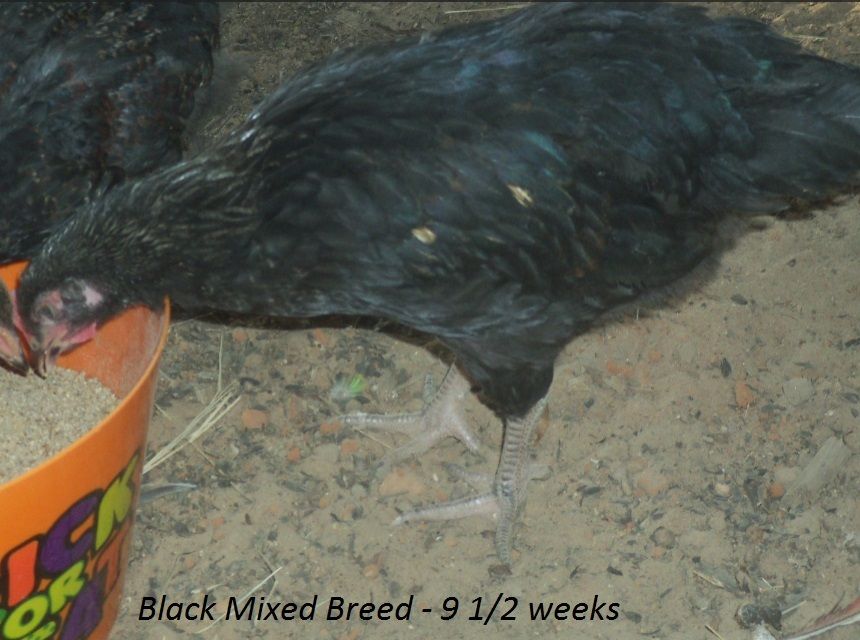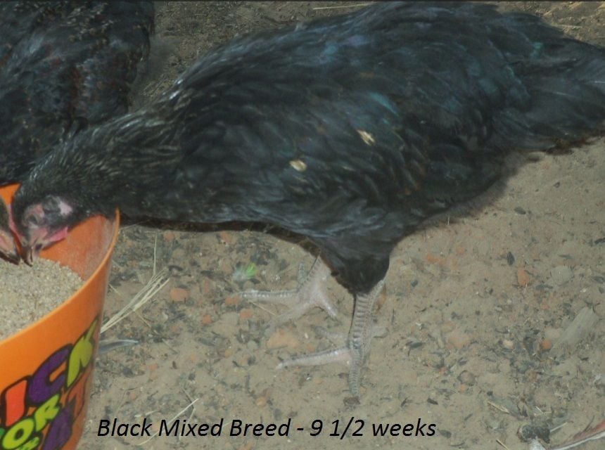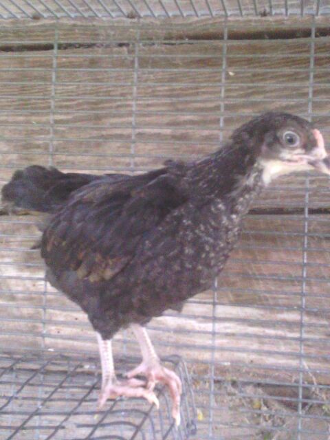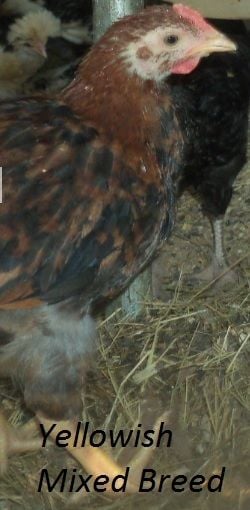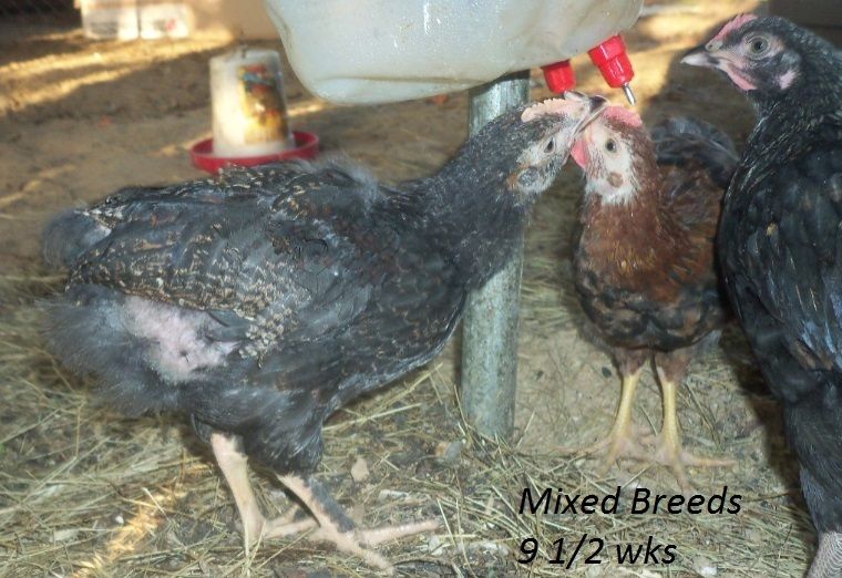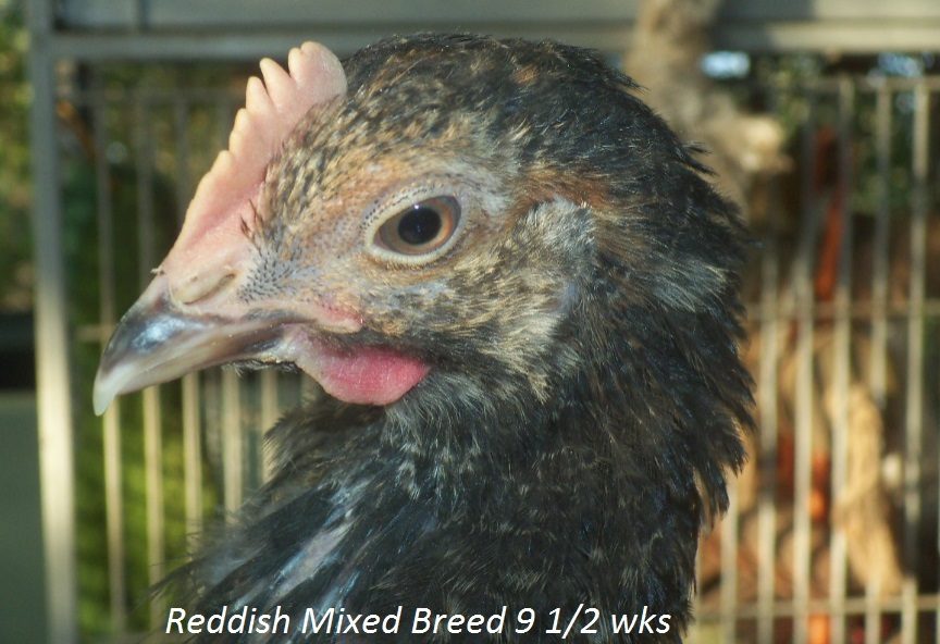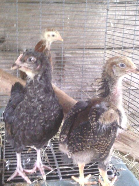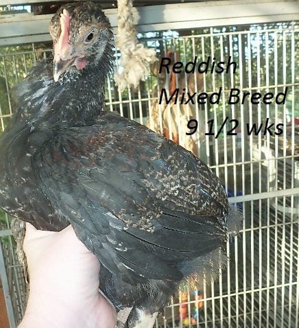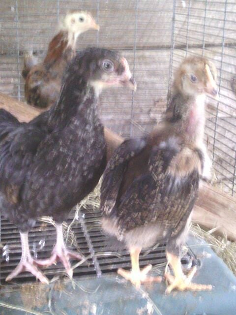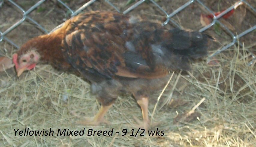 Probably some type of mix but I'm curious what you all think. I will try to get better, clearer pictures with my digital camera(so I can ask about sex too, they are 8 weeks now). Going by feathers coming in(wing feathers at a couple days old and tail feathers early) the yellowish & blackish are pullets and reddish one is roo.