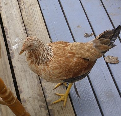Always wondered what breed(s) she was so if someone can enlighten me it would finally put my infernal curiosity to rest! My only thought is perhaps part Brahma with those markings, but Junior had no feathers on her feet. Laid small white eggs.