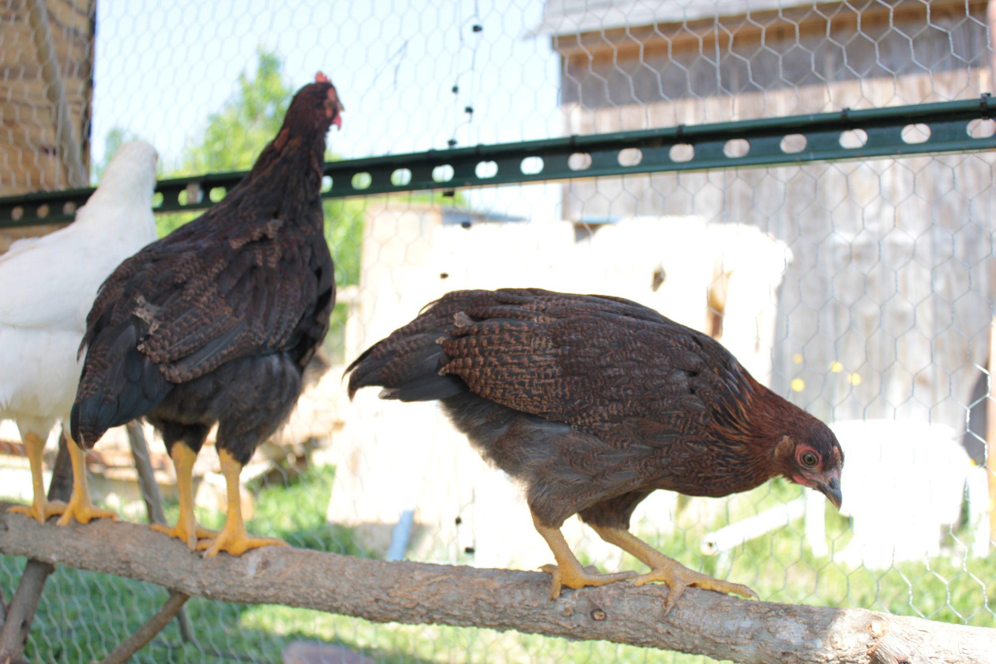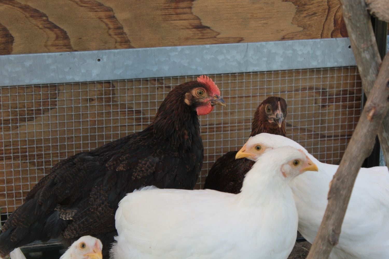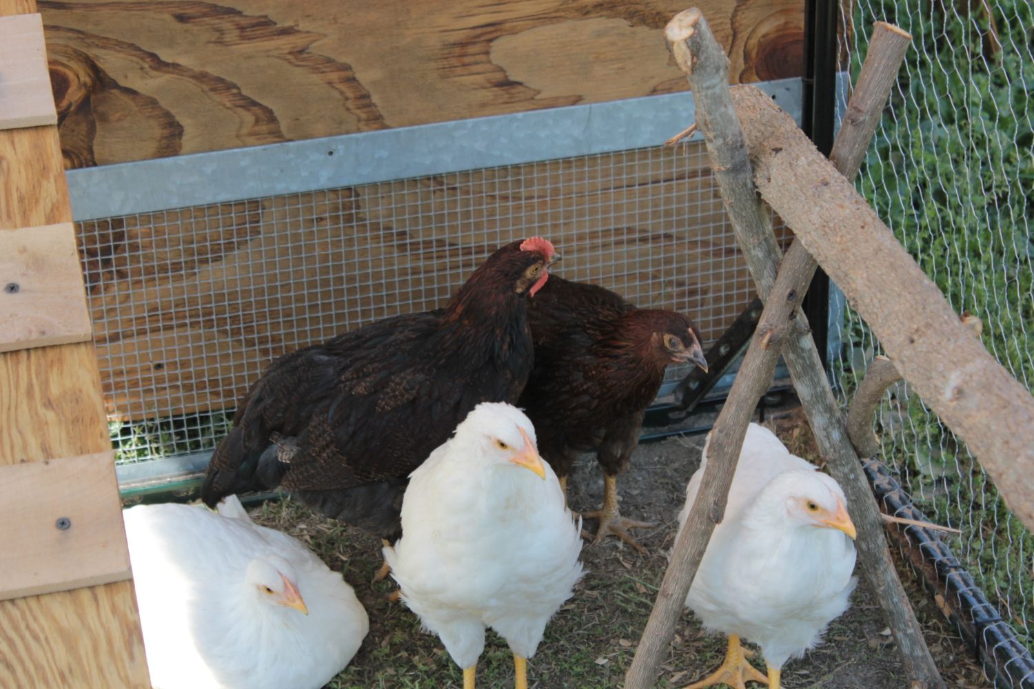 Ok so we bough 6 chicks back towards the end of February and we aren't really sure what breeds they are and we think we may have a rooster amongst our hens! There are 4 white ones all about the same size then we have two brown ones and one is much larger than the other but the smaller one is even smaller than the white ones. I think I heard the larger one try to crow twice one day but haven't heard it since then. The larger brown one also has lots of green coming in on it's back near its tail feathers! I can upload more pics if needed but I think these should give a good idea of what they look like! I was told they may be Leghorns and Rhode Island Reds but I am no expert and neither are the people who have told me this. This is our first go round with chickens! And this large brown one is the only one that has a huge crest and all the red like that.