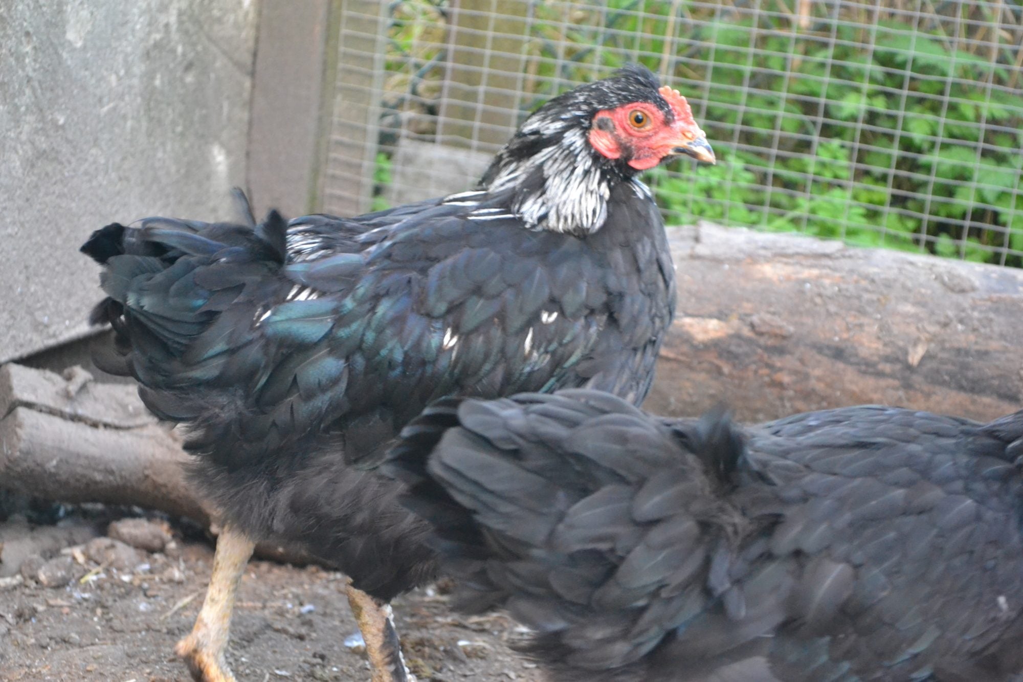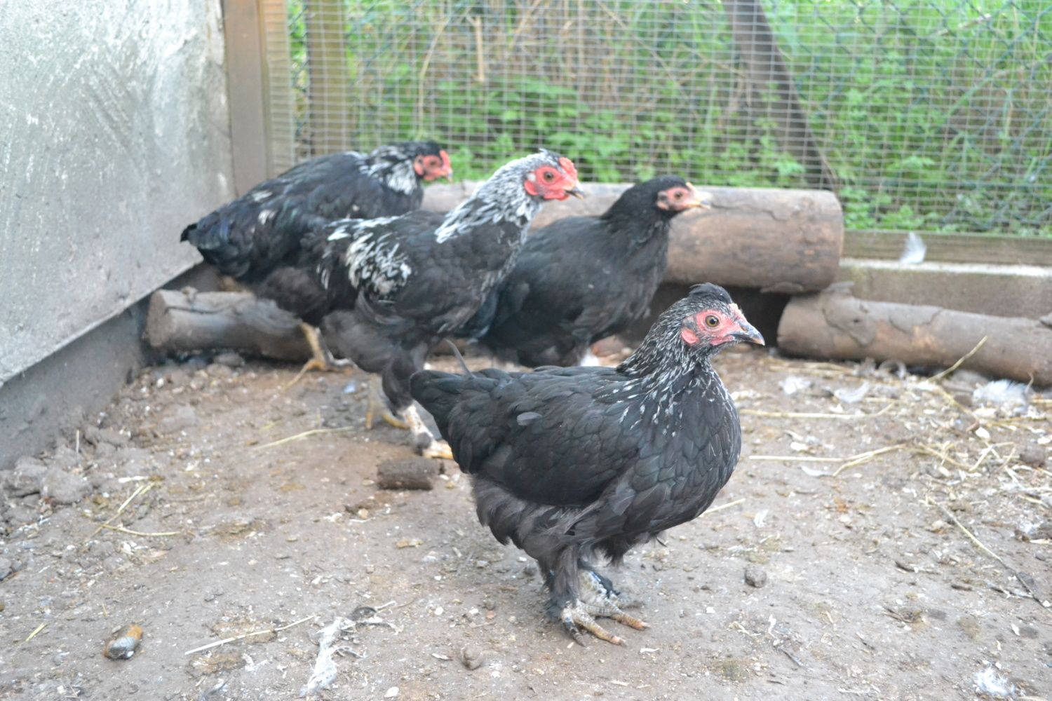 The chicks has black, white and dark green feathers and we reckon they are all hens,