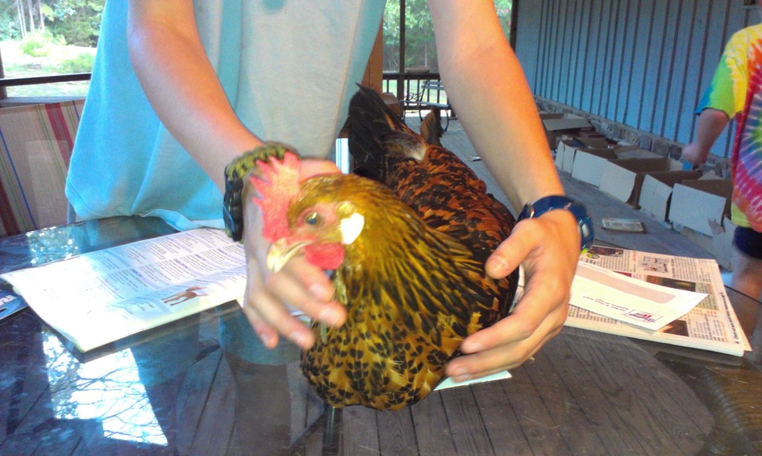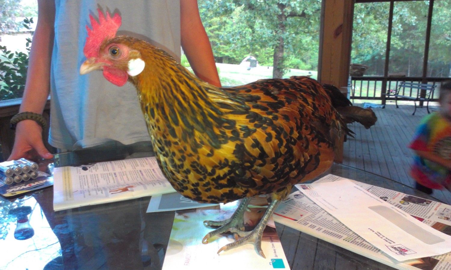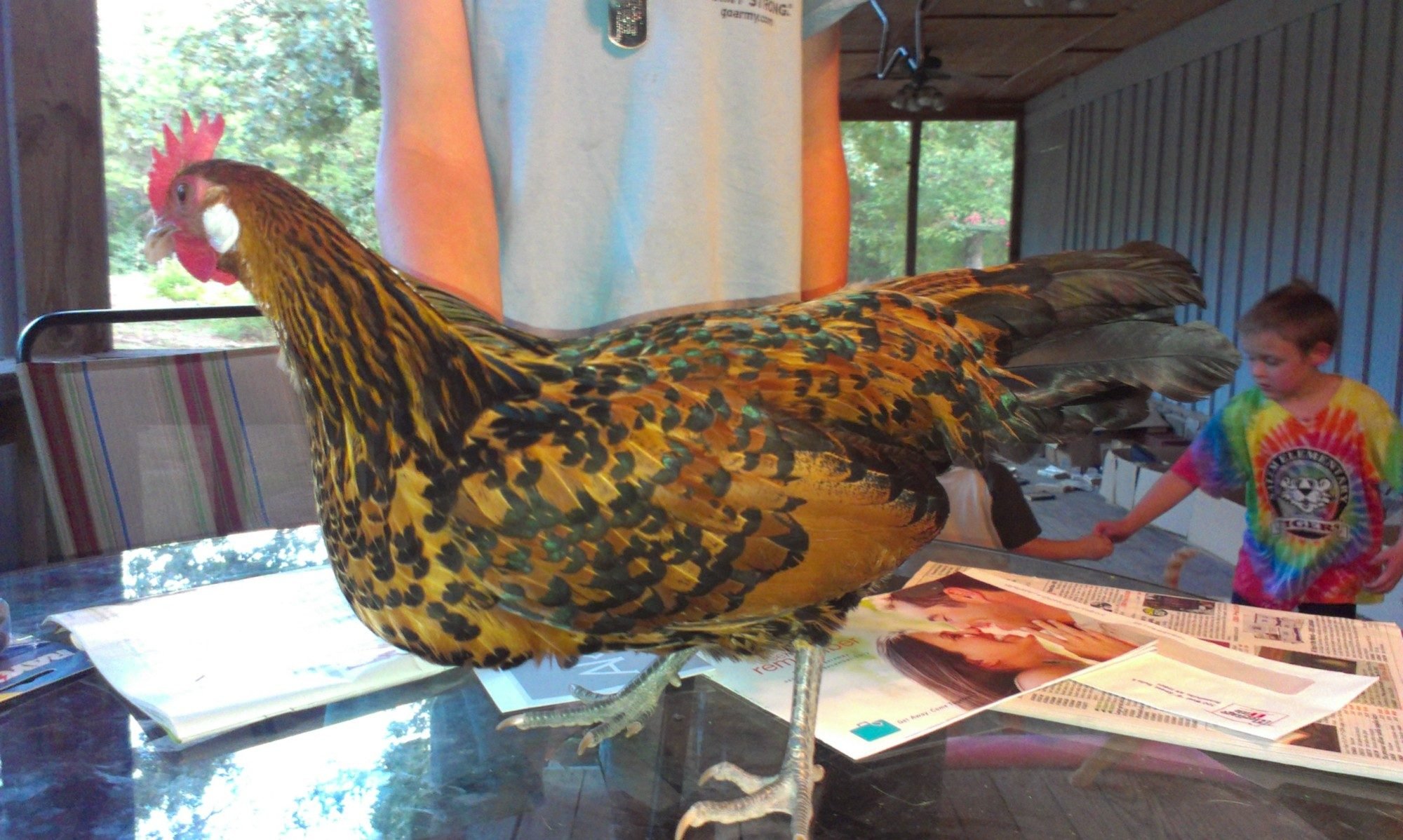 She is not a bantam but does have a small build. She has dark willow or slate legs, white earlobes, single comb, lays a very small light beige egg. Was very flighty at first but now is very friendly. She is currently 6 months old. Very strongly resembles Red Caps but does not have the correct comb at all for that.
