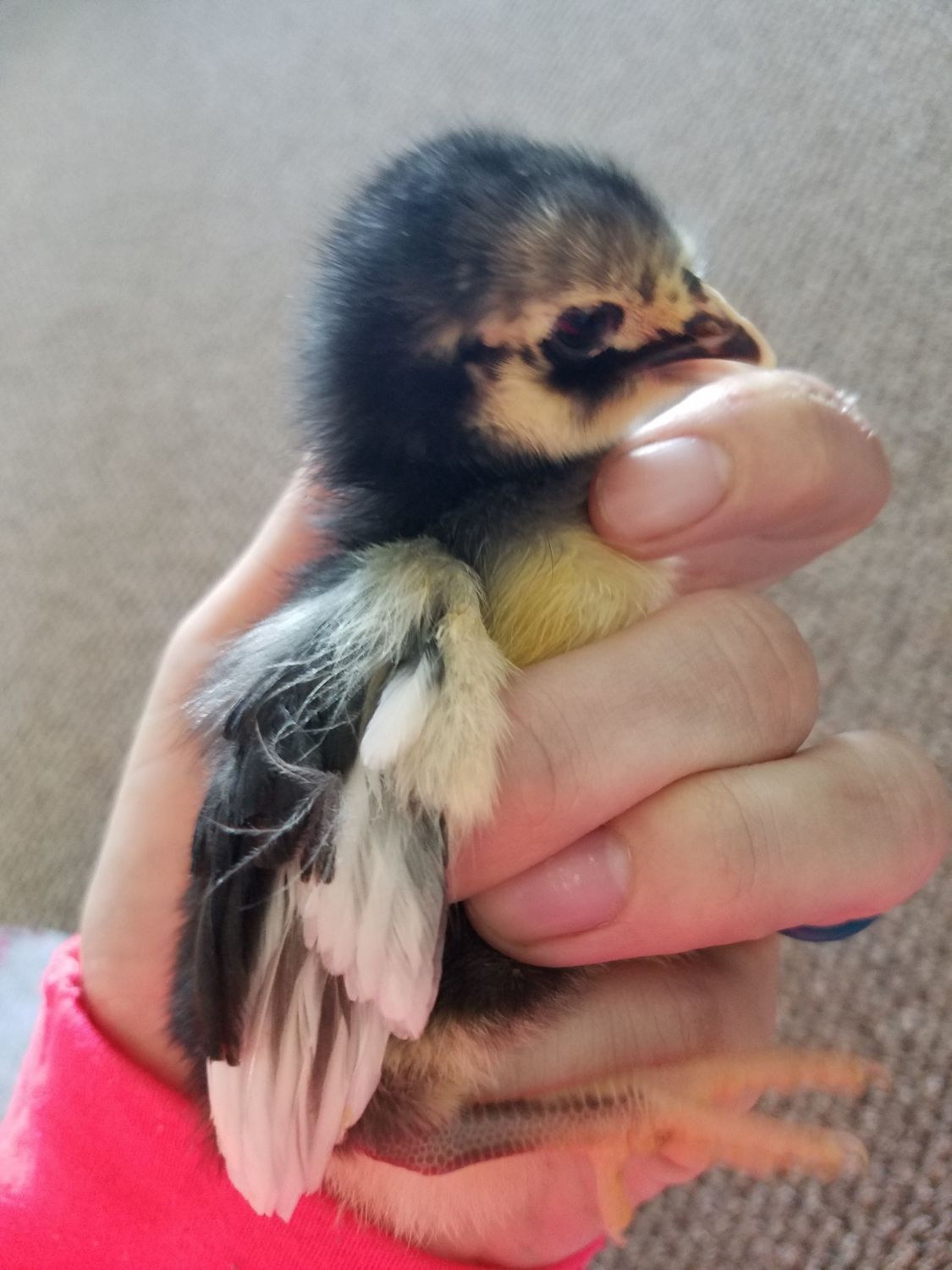 Got two of these babies in a mixed color wyandotte bin. There were about 15 in the bin. The sign had all sorts of wyandotte colors listed. Is it a Wyandotte? Black maybe? Doesn't quite look like my Australorp (shown in 1st pic behind it) and has more white on wings. Same comb as wyandotte. Not growing very fast either. ??
