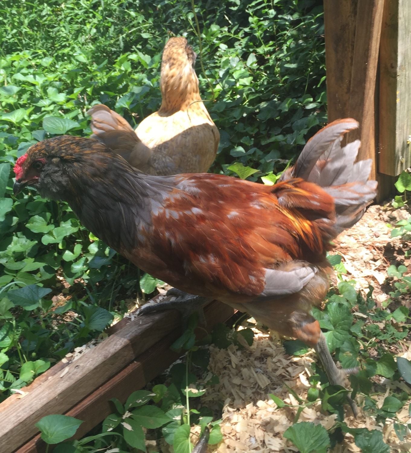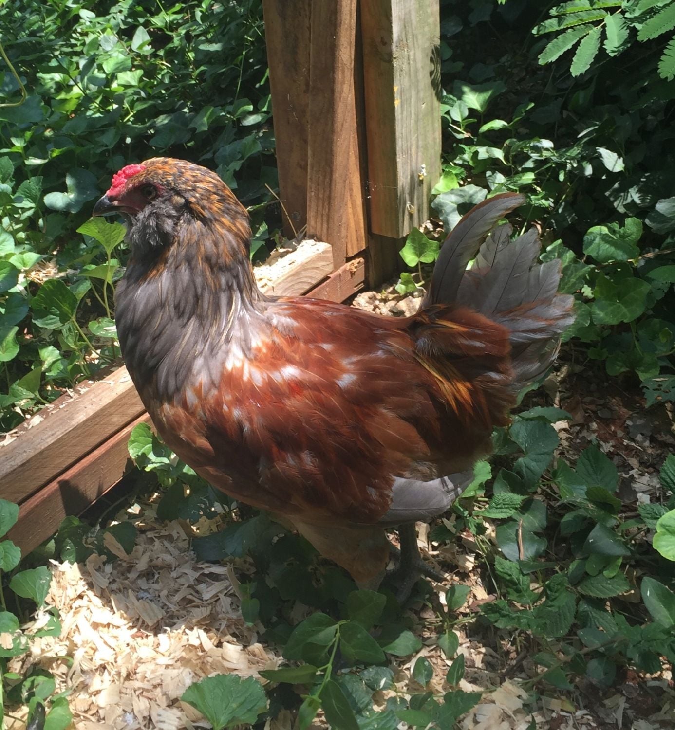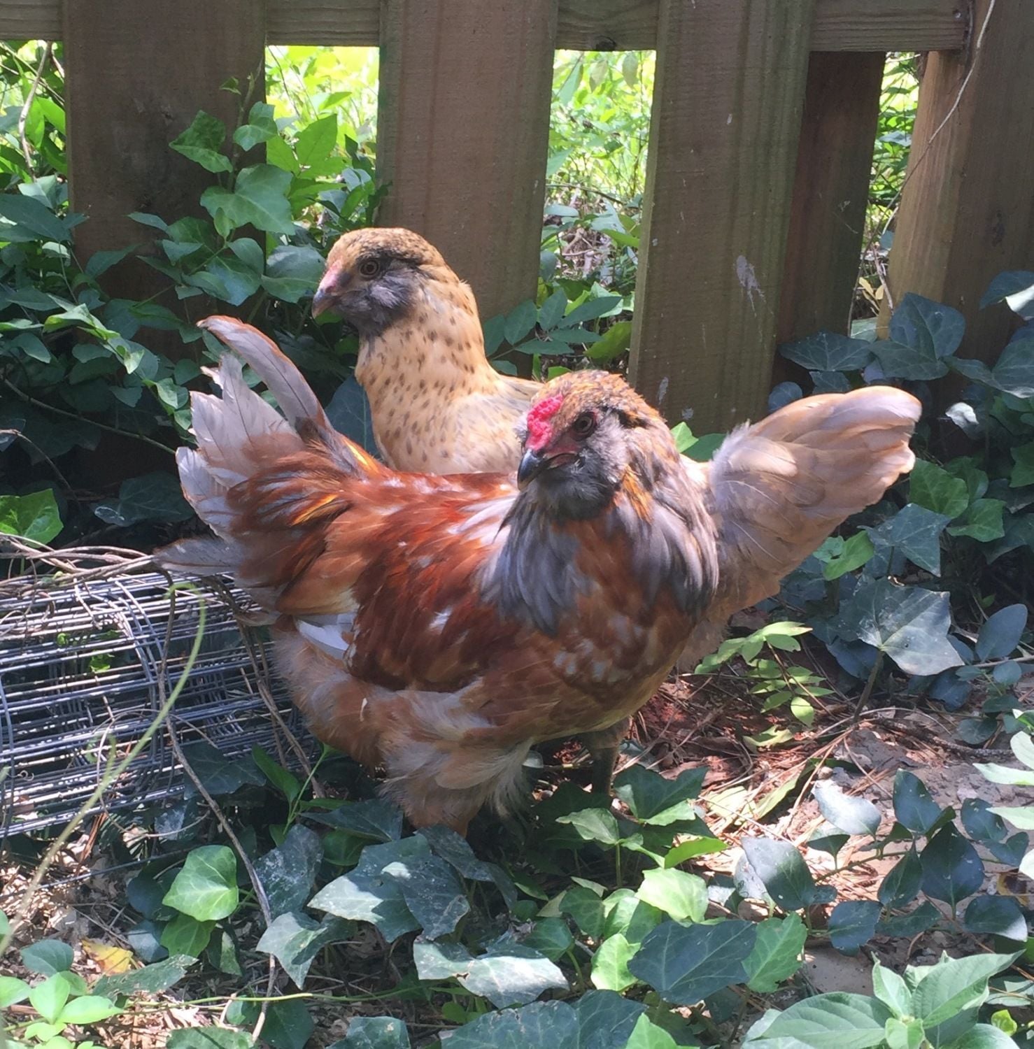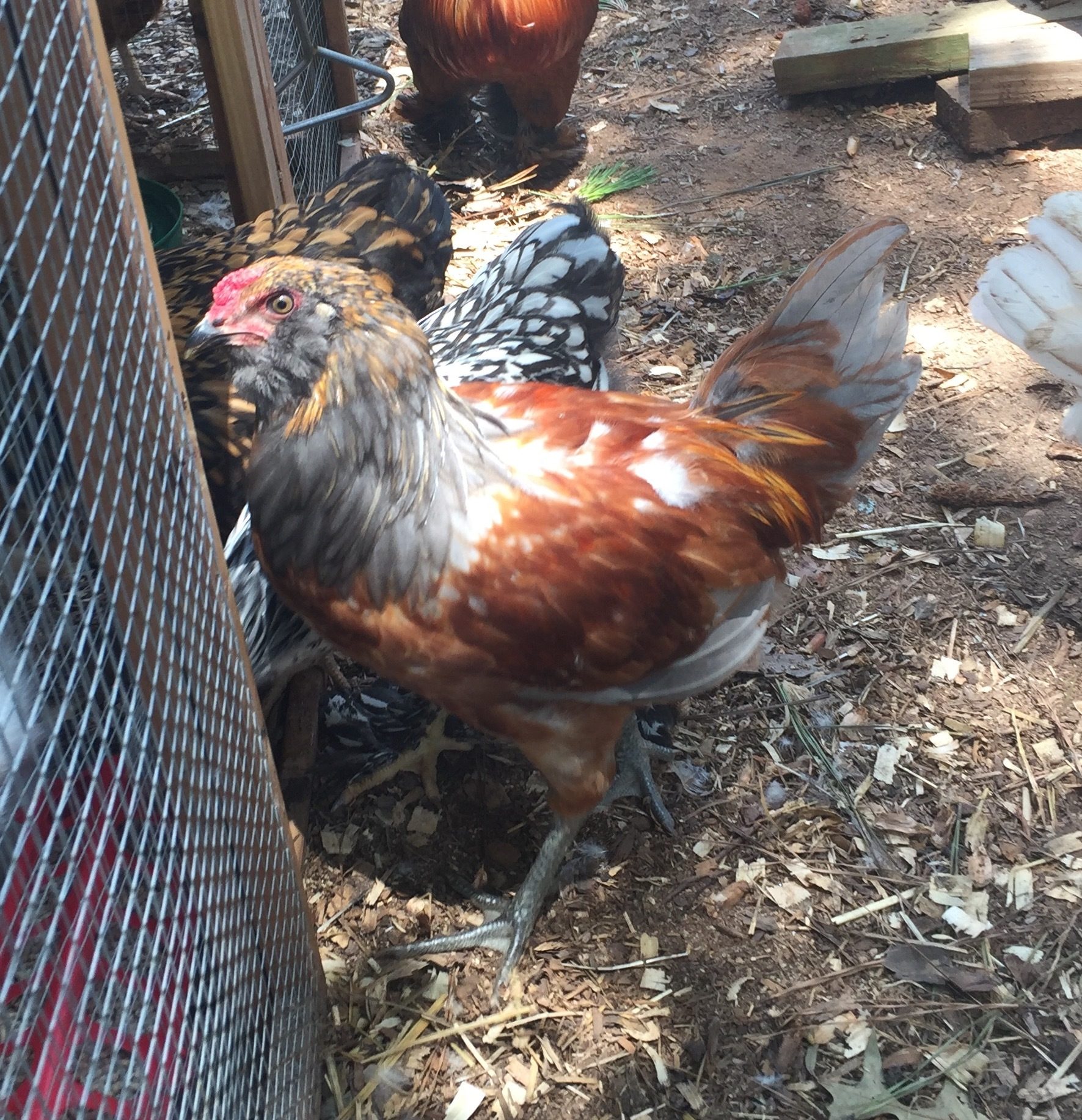 We've had two past rooster (still currently have one) and they always sprouted green tail feathers and this one has bright orange/gray. Has anyone had a rooster like this before? If we have 15 hens would it be okay to have two roosters together or is it better to rehome Peggs? See more pictures below: